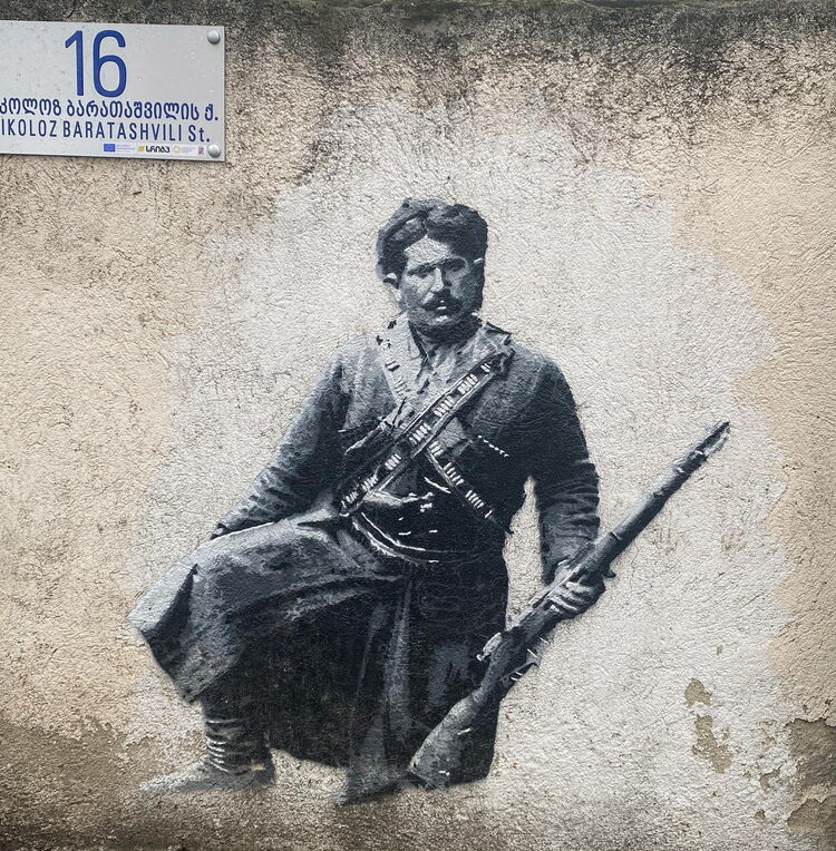 Vaska Shuradze (V45) ist ein Architekt und Künstler aus Tbilisi. Sein größtes Mural ist das Portrait des georgischen Dissidenten und Kämpfer der Freiheitsbewegung Merab Kostava im Wedha’s Pop Art Stil.