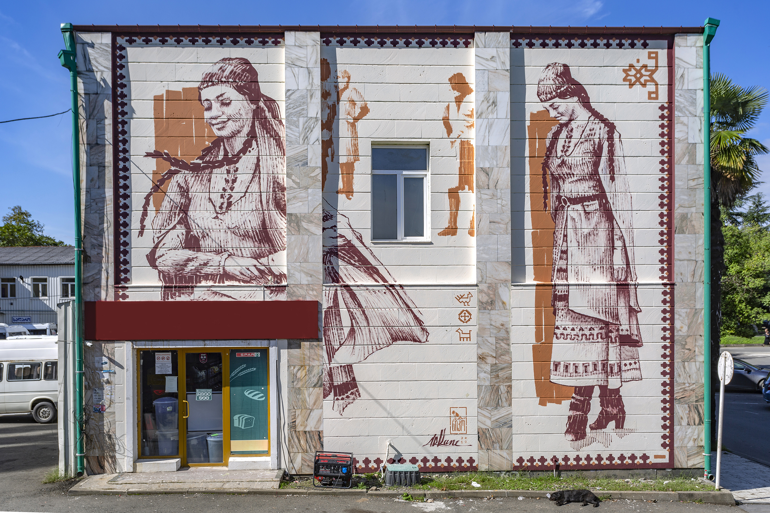 For my wall, I decided to work in an engraving way (sketchbook orientation) witv only 2 tones to celebrate old techniques and also old traditional costumes from Georgian traditional dance.