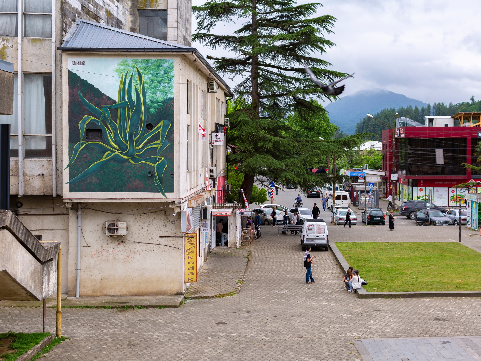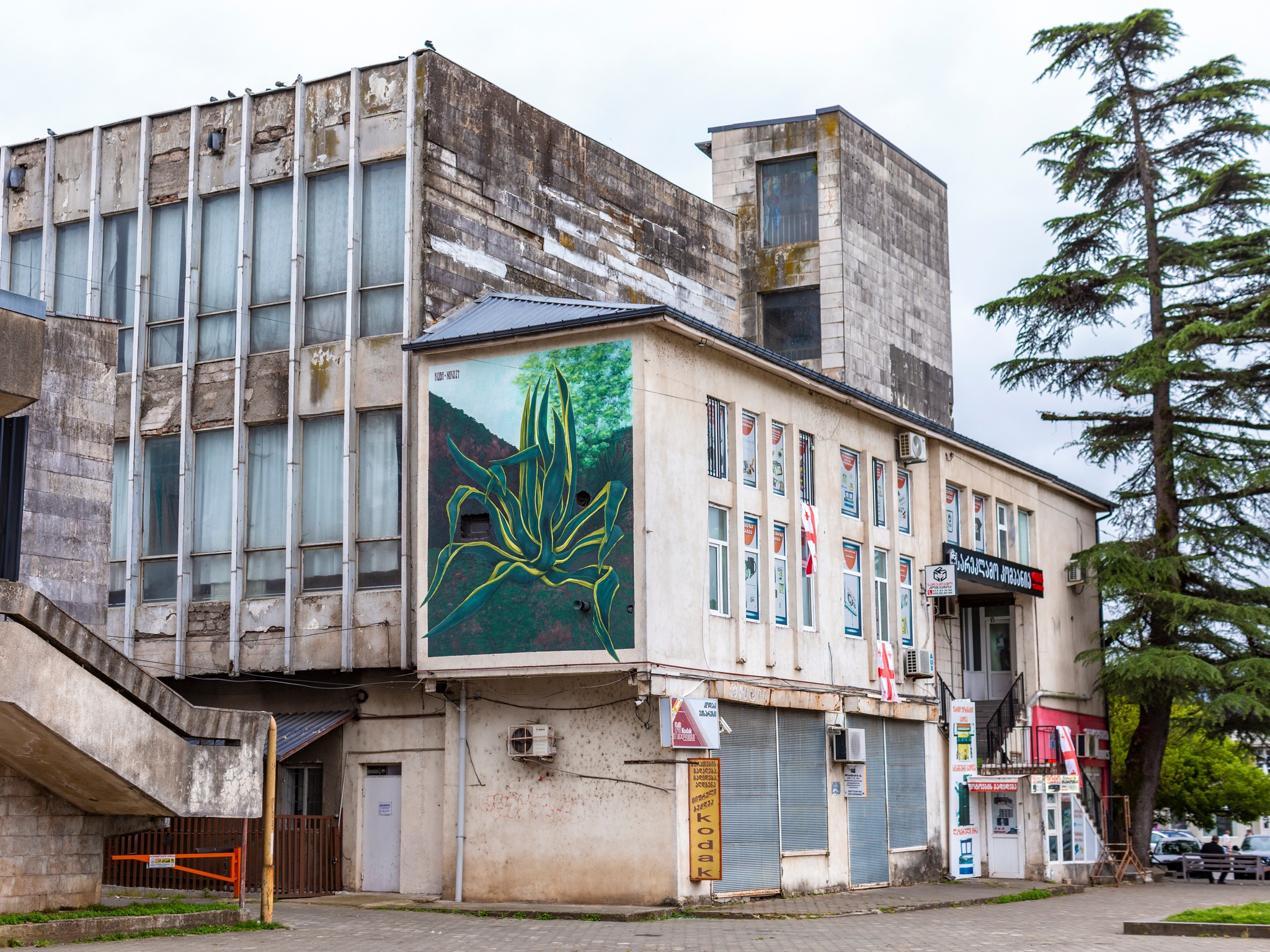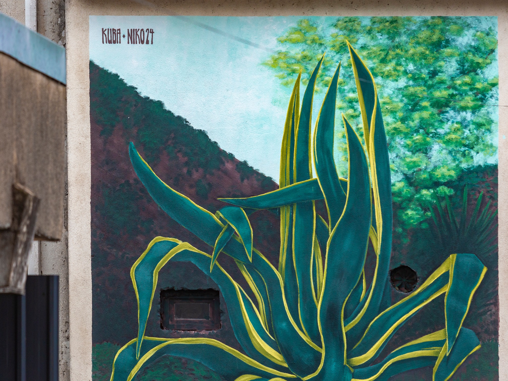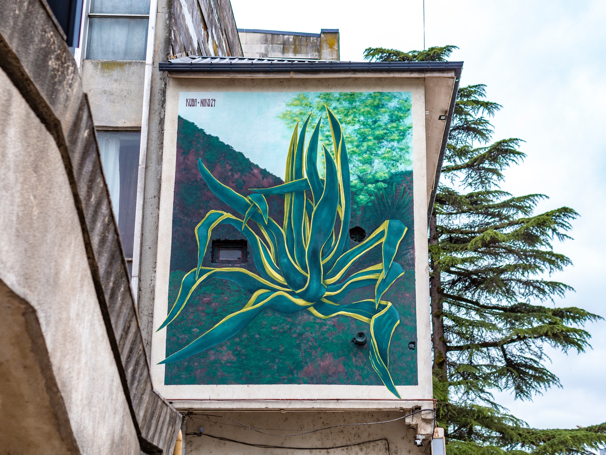 By strolling through Ozurgeti I realized that there was a big amount of Agaves growing everywhere, from sidewalks to people’s gardens. As I was looking for a motive with a connection to the local community, I decided to choose the Agave. The colors matched the surrounding architecture and I liked the idea of bringing more nature to the square, where the wall was situated. The reference picture was taken more than two years ago, at a friend’s garden in Barcelona. For me it’s a special, almost spiritual, being, with a very interesting life and reproduction cycle. It’s one of my favorite plants and I even keep one at my home in Leipzig.