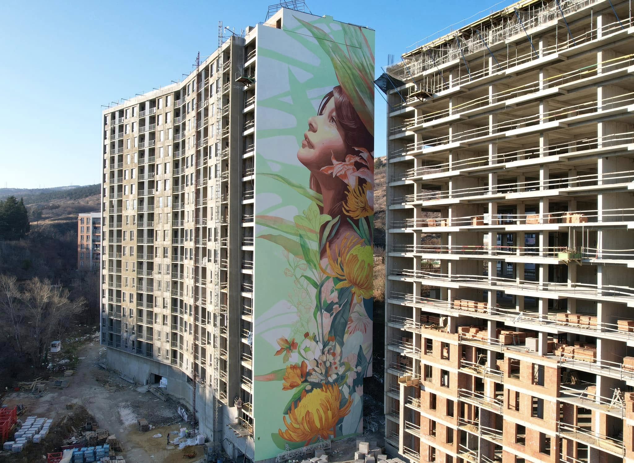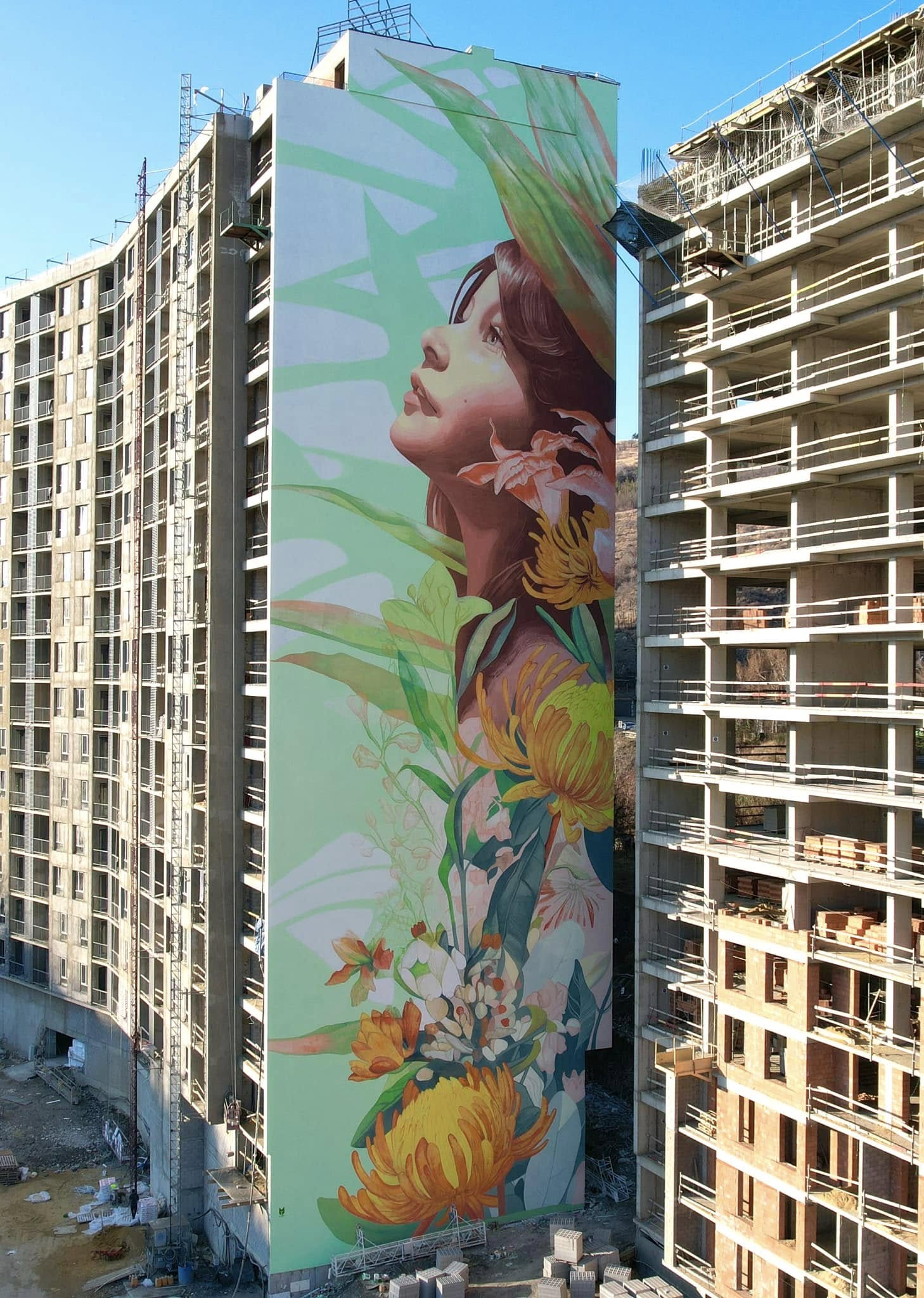 "Girl looking up" ist ein monumentales Mural von Cristian Scutaru, Afzan Pirzade und TMF Studio, in Zusammenarbeit mit Sphera Development. Das Werk zeigt ein Mädchen, das von Blumen umgeben zum Himmel blickt, und misst beeindruckende 70 Meter Höhe und 20 Meter Breite - das größte Mural in Georgien. Es befindet sich an der Fassade eines Neubaus mitten in der Plattenbausiedlung Nutsubidze am nördlichen Stadtrand von Tbilissi und soll dort Farbe, Lebensfreude und Inspiration in den Alltag der Menschen bringen.
