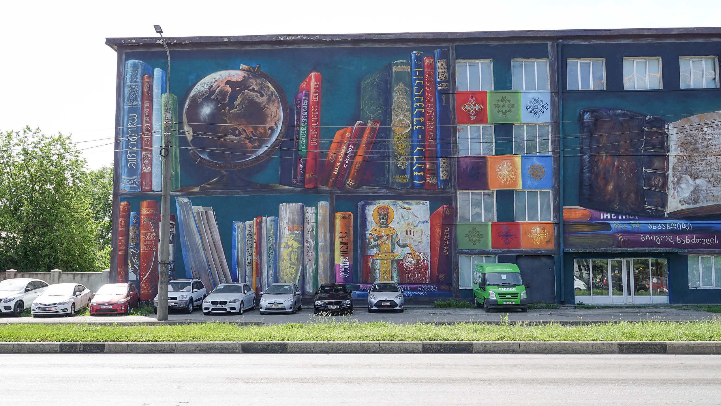 Mural an der Fassade des Niko-Nikoladze-Gebäudes der Nationalbibliothek Georgiens, die das größte Buchlager im Kaukasus mit rund 3 Millionen Büchern beherbergt.