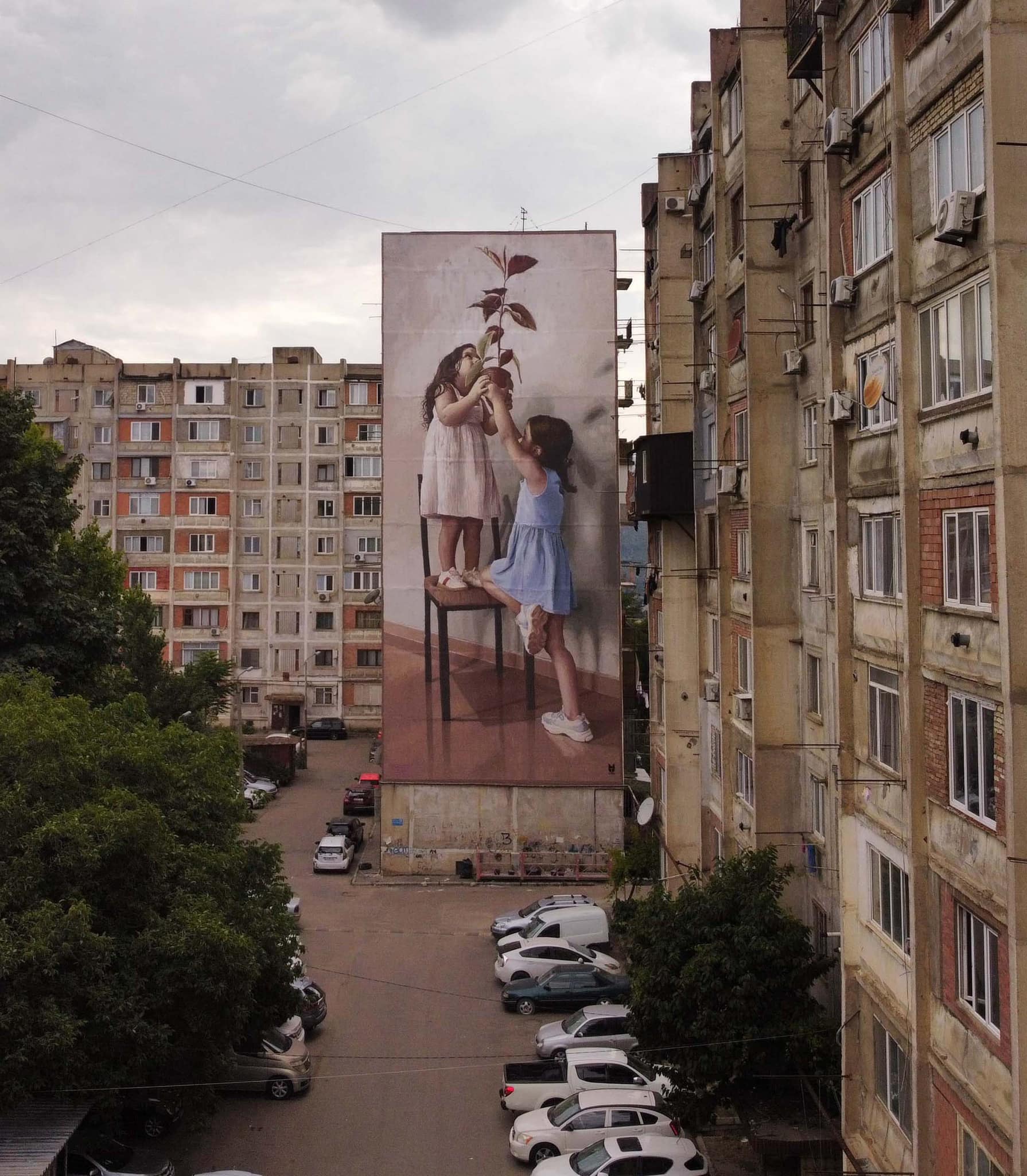 The work is part of a series of works that investigate the act of looking beyond. In this case the subjects are two little girls trying to place a plant on top of the building so that it can receive the light it needs to survive. The composition and colour choice of the work take their cue from the context surrounding the wall. The aim is to make the viewer aware of the responsibility we have towards nature, the health of which depends solely and exclusively on us to conserve and preserve it for the present and the future.