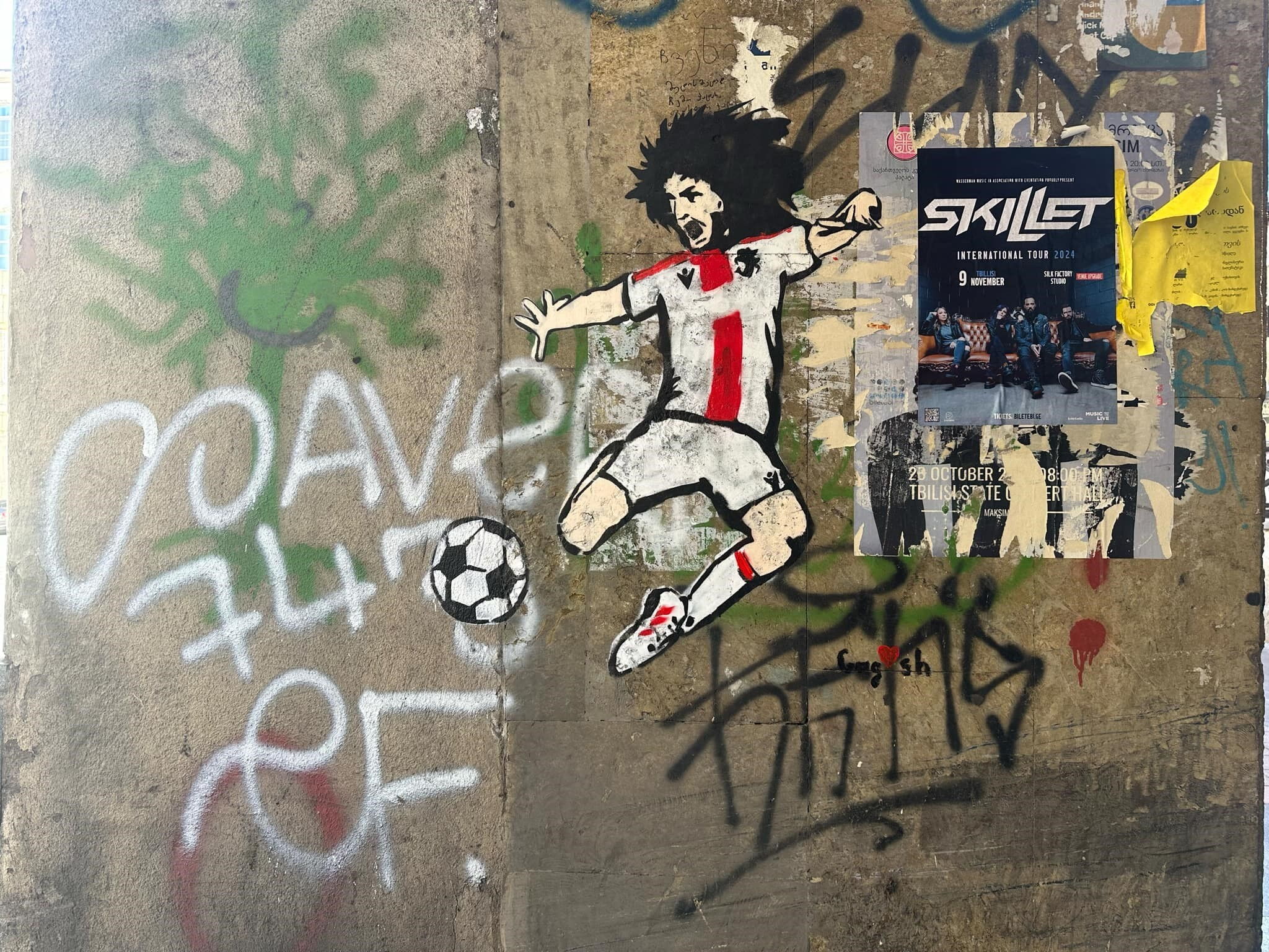 Fußballspieler der Nationalmanschaft in der Pose und Tracht (Kopfbedeckung) des traditonellen georgischen Tanzes.