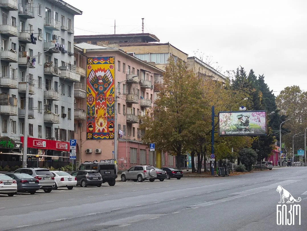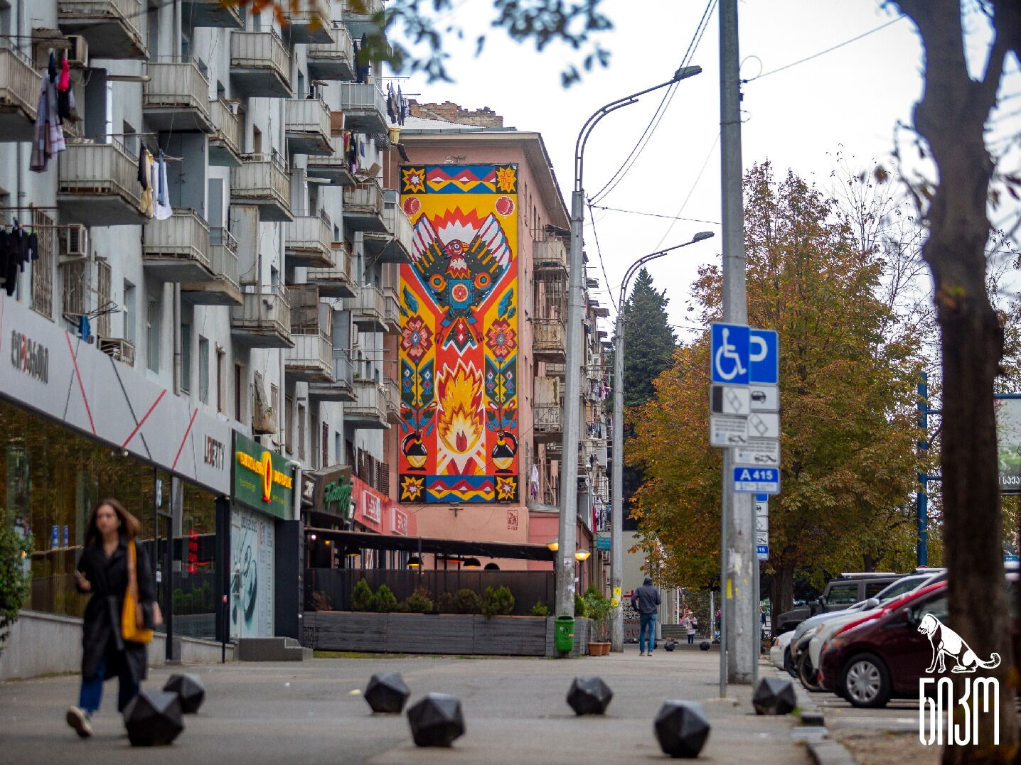 I’m jumu artist from Berlin, with Peruvian & chilenean roots . This mural represent a phoenix as a symbol for a new beginning. The idea was to make a composition of a traditional carpet. With floral element, vases and the sun that inspires me in my traveling to Tiblisi.