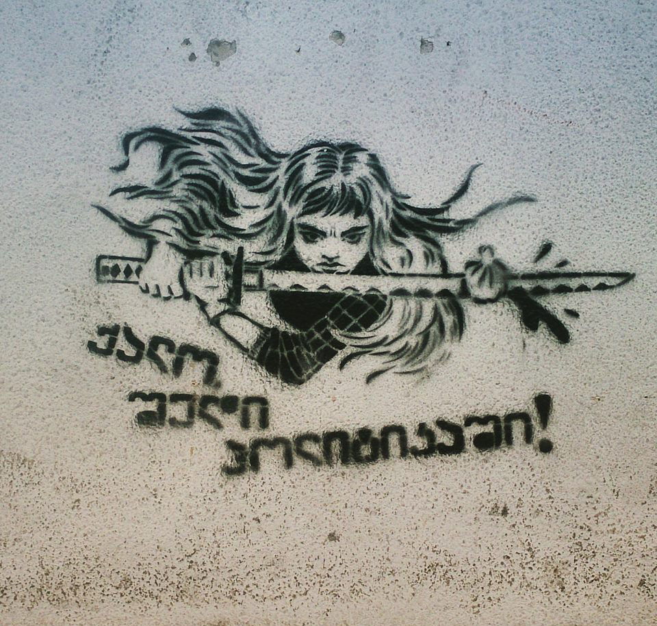 Darunter der Text: "ქალო შედი პოლიტიკაში!" (dt. "Frau, geh in die Politik!")