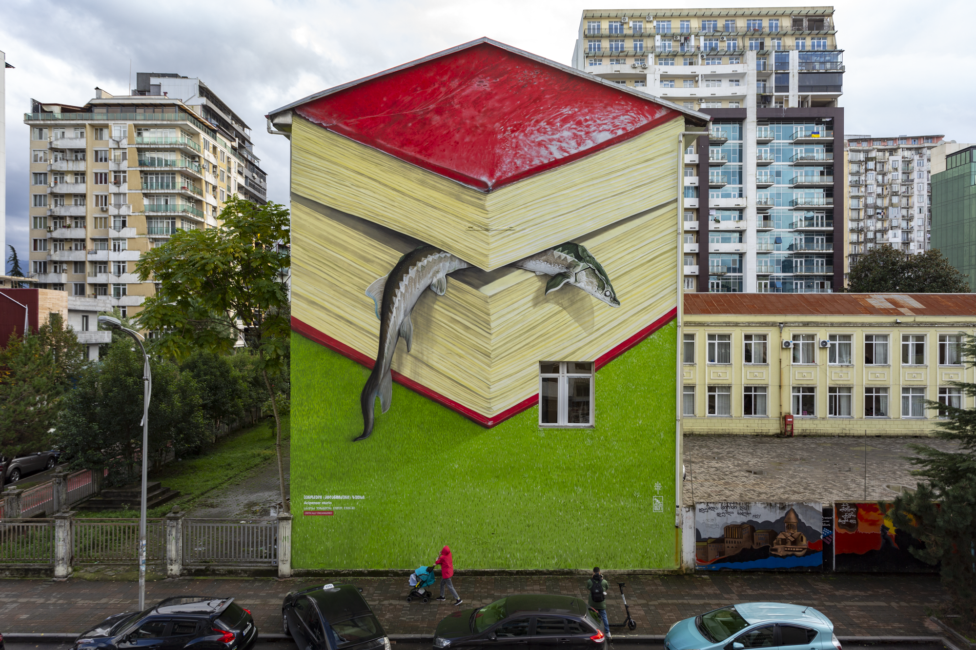 Der Europäische Stör (Acipenser Sturio) kommt in Südwestfrankreich und Westgeorgien vor und wird in seinem gesamten Verbreitungsgebiet gemäß dem Endangered Species Act (IUCN Red List) als gefährdet aufgeführt. Einst war es in Küstengebieten im gesamten Schwarzen Meer und insbesondere in Georgien reichlich vorhanden und steht jetzt am Rande des Aussterbens. Ich habe dieses Thema speziell für das Wandgemälde am Schulgebäude gewählt, um das Bewusstsein für gefährdete Arten in der jüngeren Generation zu schärfen und hoffe, dass es zu ihrer Zukunft beitragen wird. 🐟