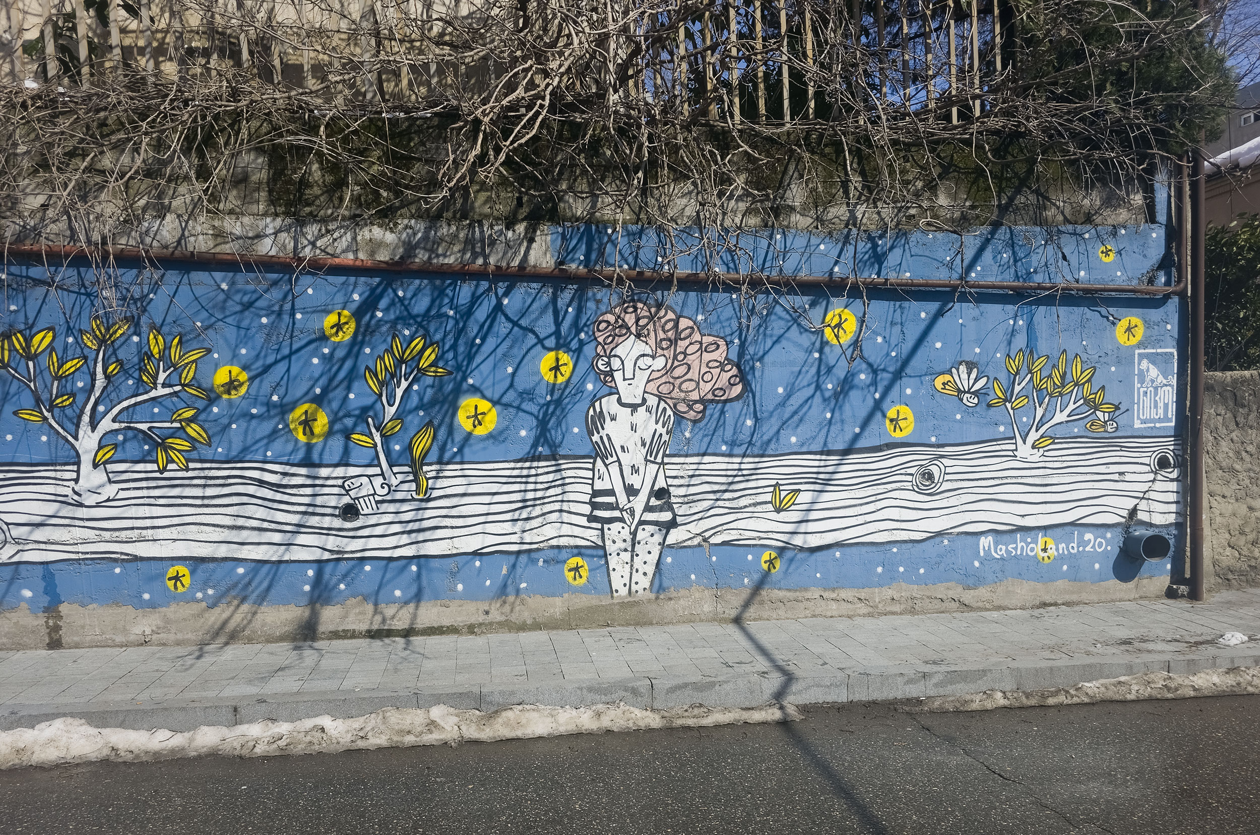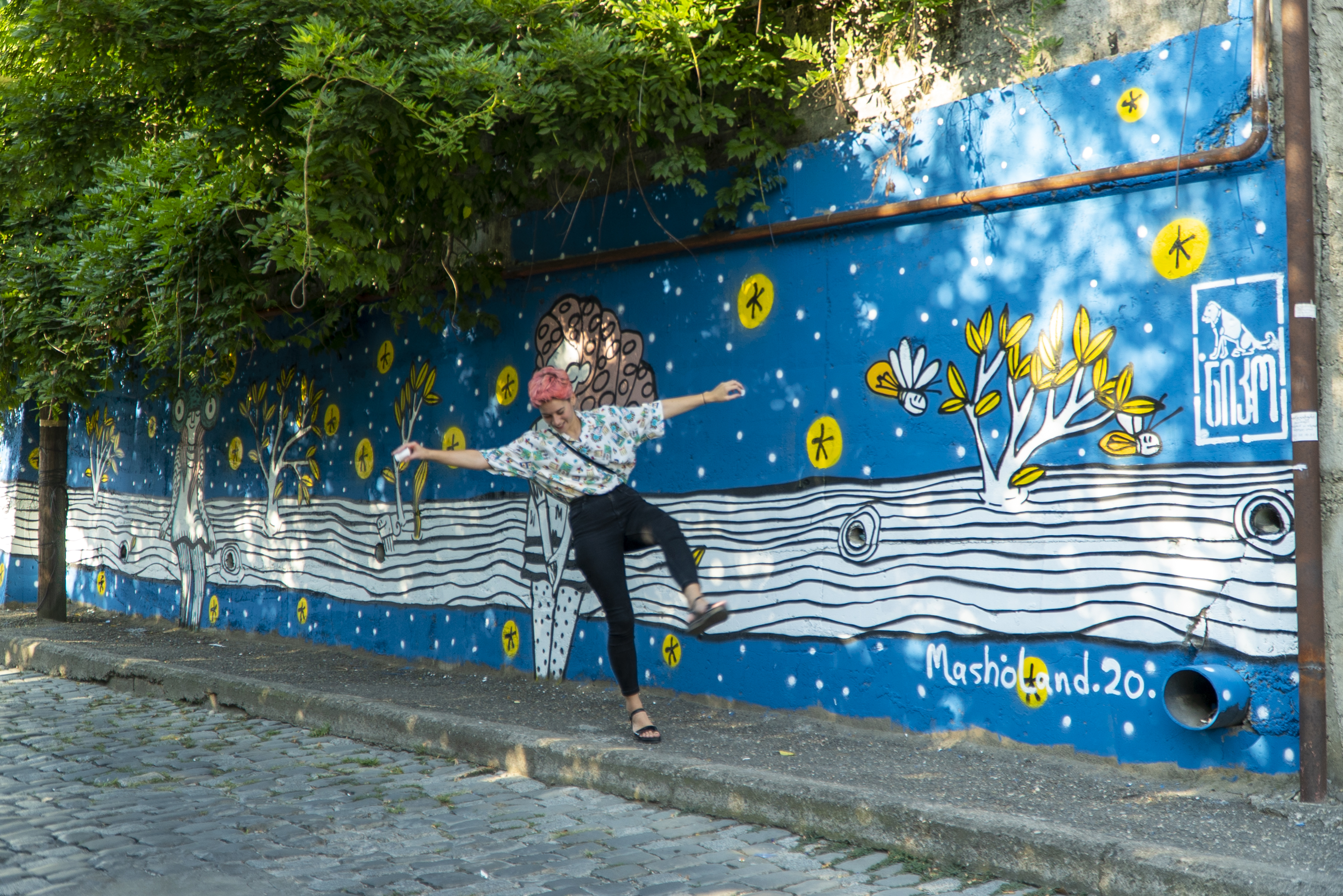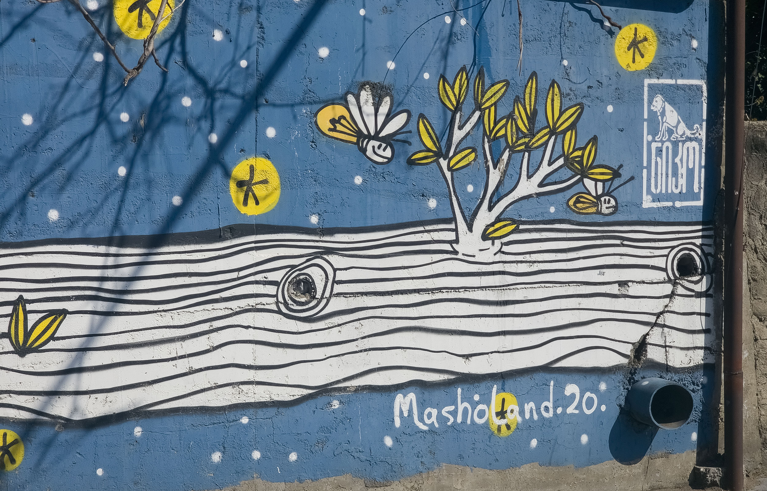 This mural is dedicated to the magic felt during childhood - hot summers, playing with kids before dawn, wearing animal masks, and looking at fireflies sitting on the electric wires after the sun goes down.
