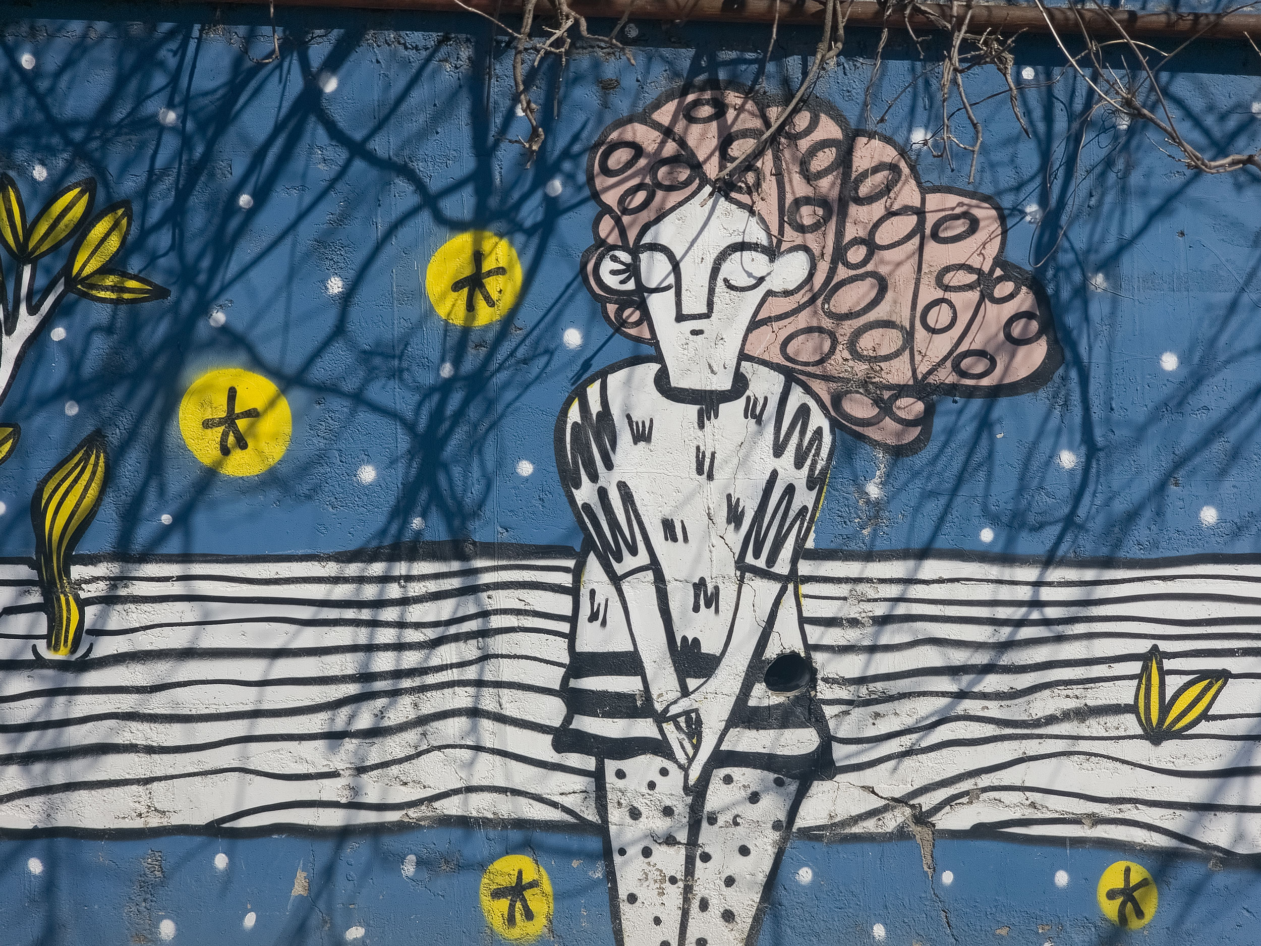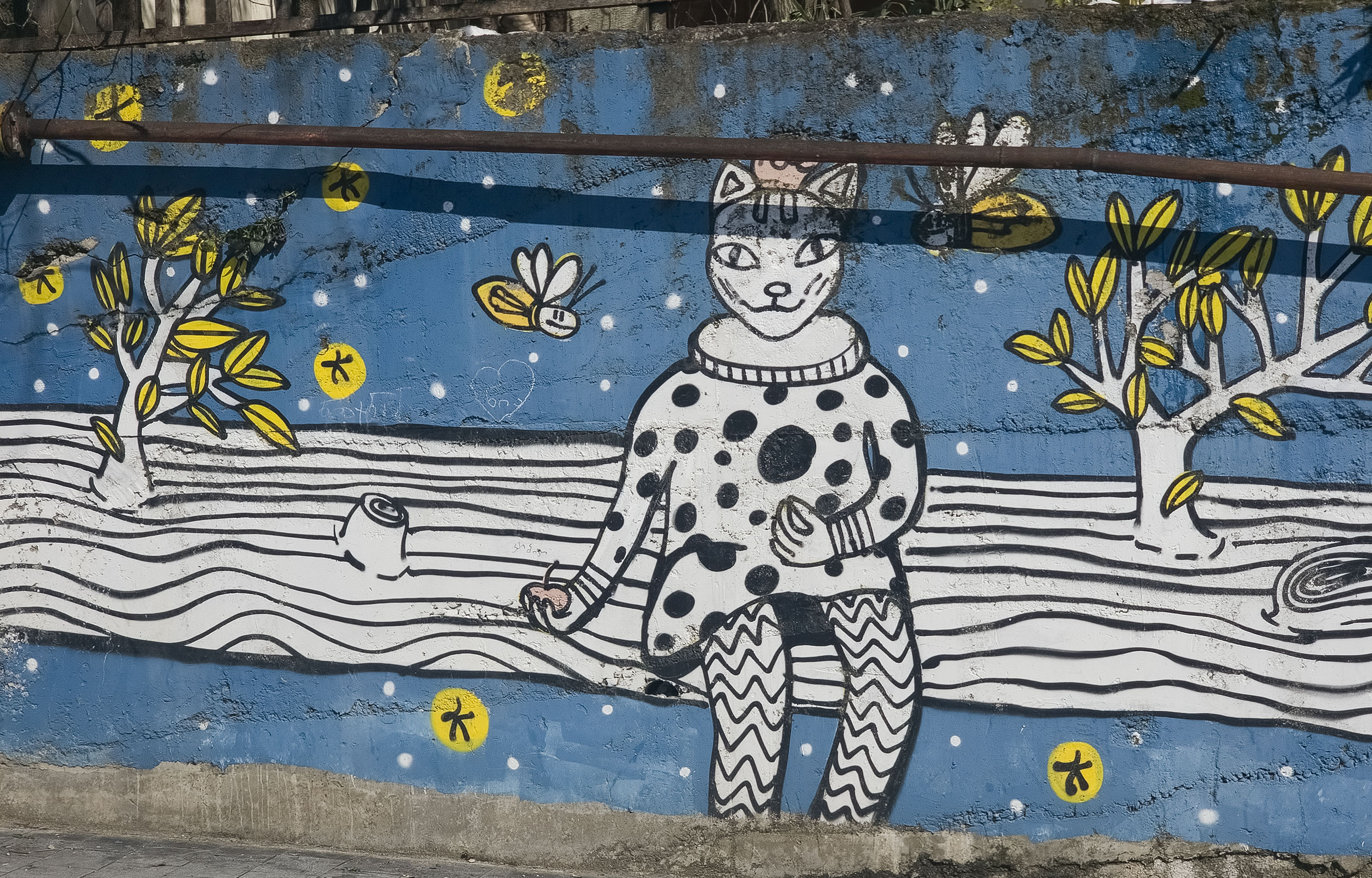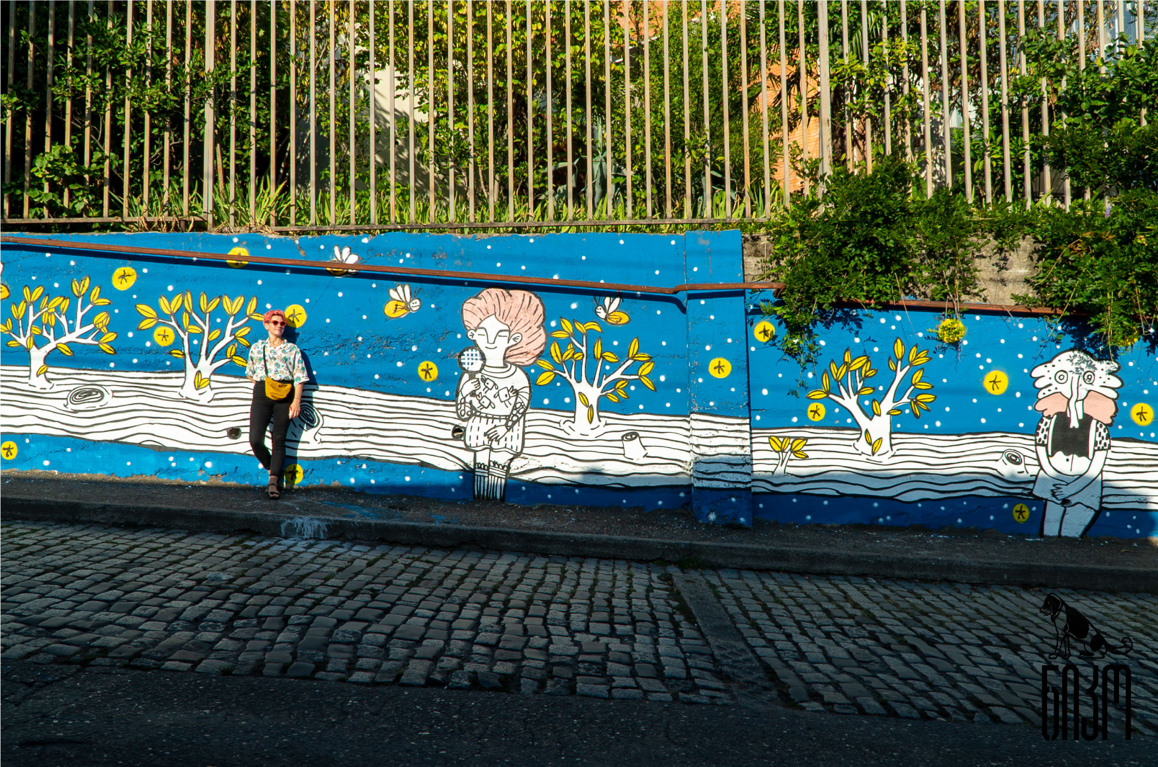 This mural is dedicated to the magic felt during childhood - hot summers, playing with kids before dawn, wearing animal masks, and looking at fireflies sitting on the electric wires after the sun goes down.