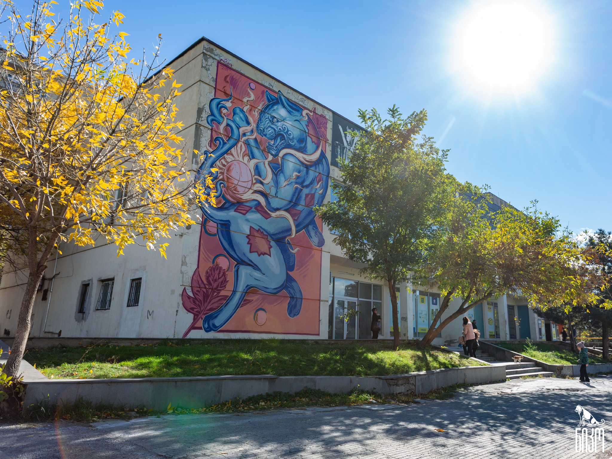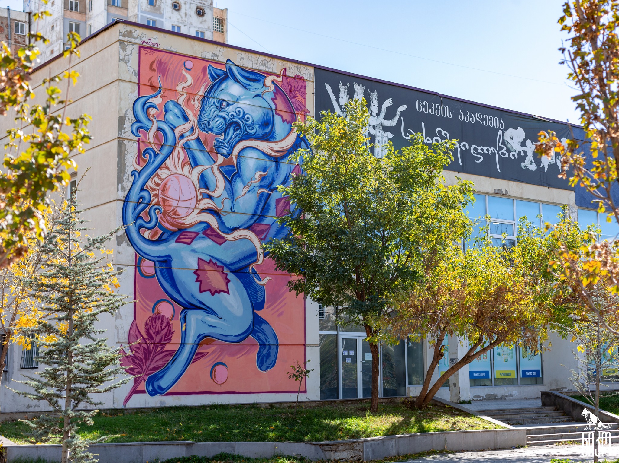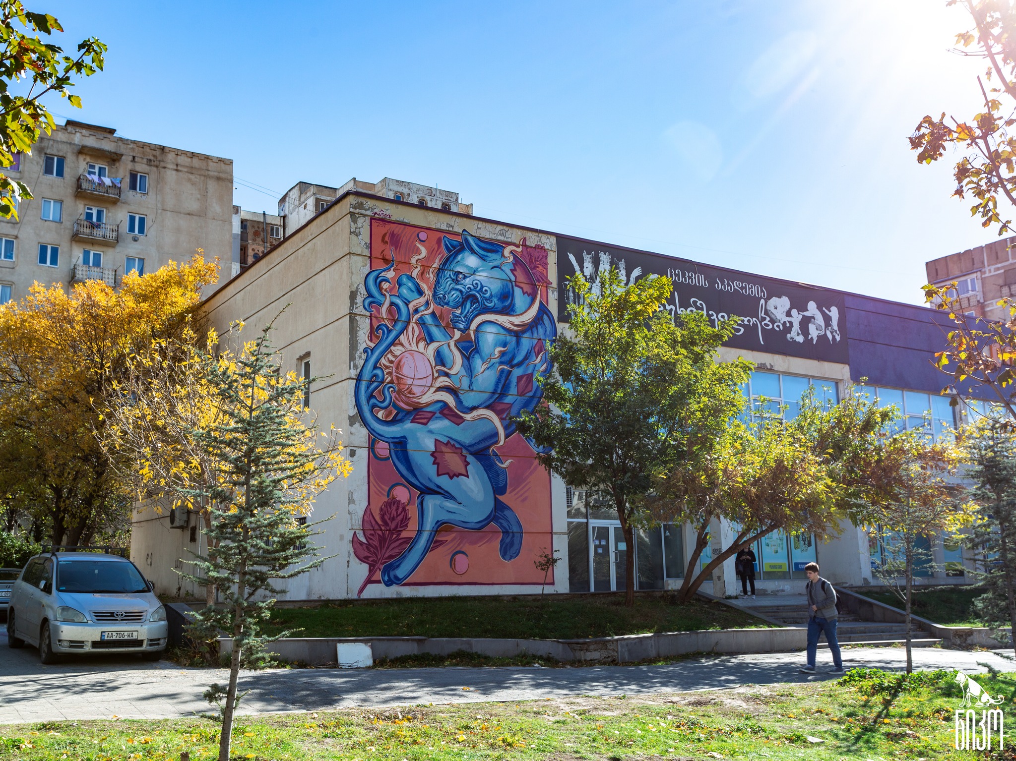 Die Grundidee für die Katzenfigur, die auf eine Wand in einem Supermarkt im Stadtteil Varketeli gemalt wurde, stammt von einem Plastikreliefmodell, das sich an der Wand des Fabrica-Komplexes in Tbilisi befindet. Ich wurde darüber informiert, dass das Kunstwerk auf dem berühmten georgischen Epos "Der Recke im Pantherfell" basiert, und davon inspiriert, baute ich das Konzept auf der Figur des Panthers auf, der mit einem der stärksten georgischen Bildelemente, der Sonne, interagiert. Generell musste ich ziemlich schnell auf die Idee kommen, da das Projekt ziemlich spontan verwirklicht wurde, da Sandro von Niko Movement die Genehmigung zum Streichen dieser Wand ein paar Tage vor Beginn der eigentlichen Produktion organisierte.
