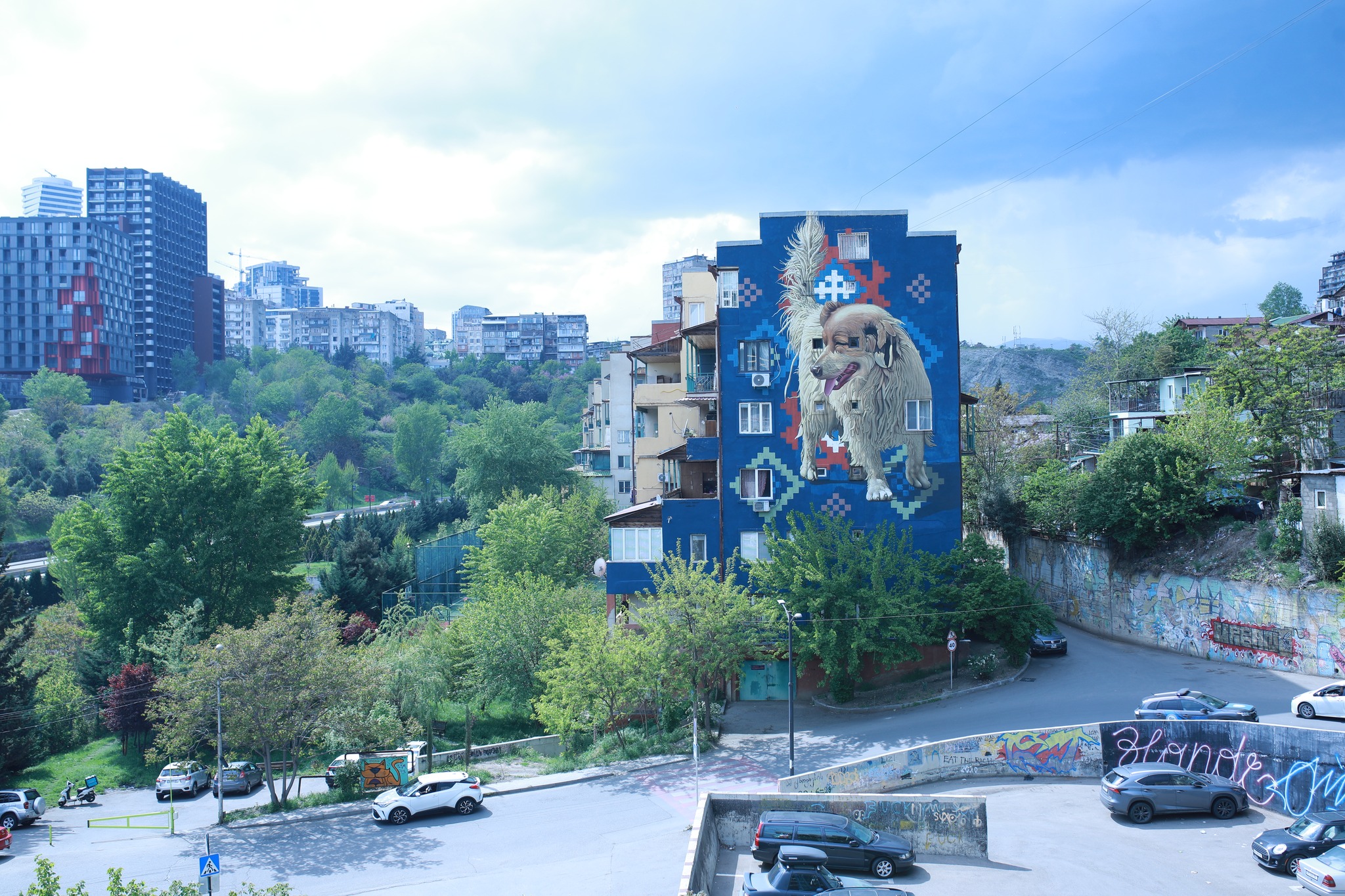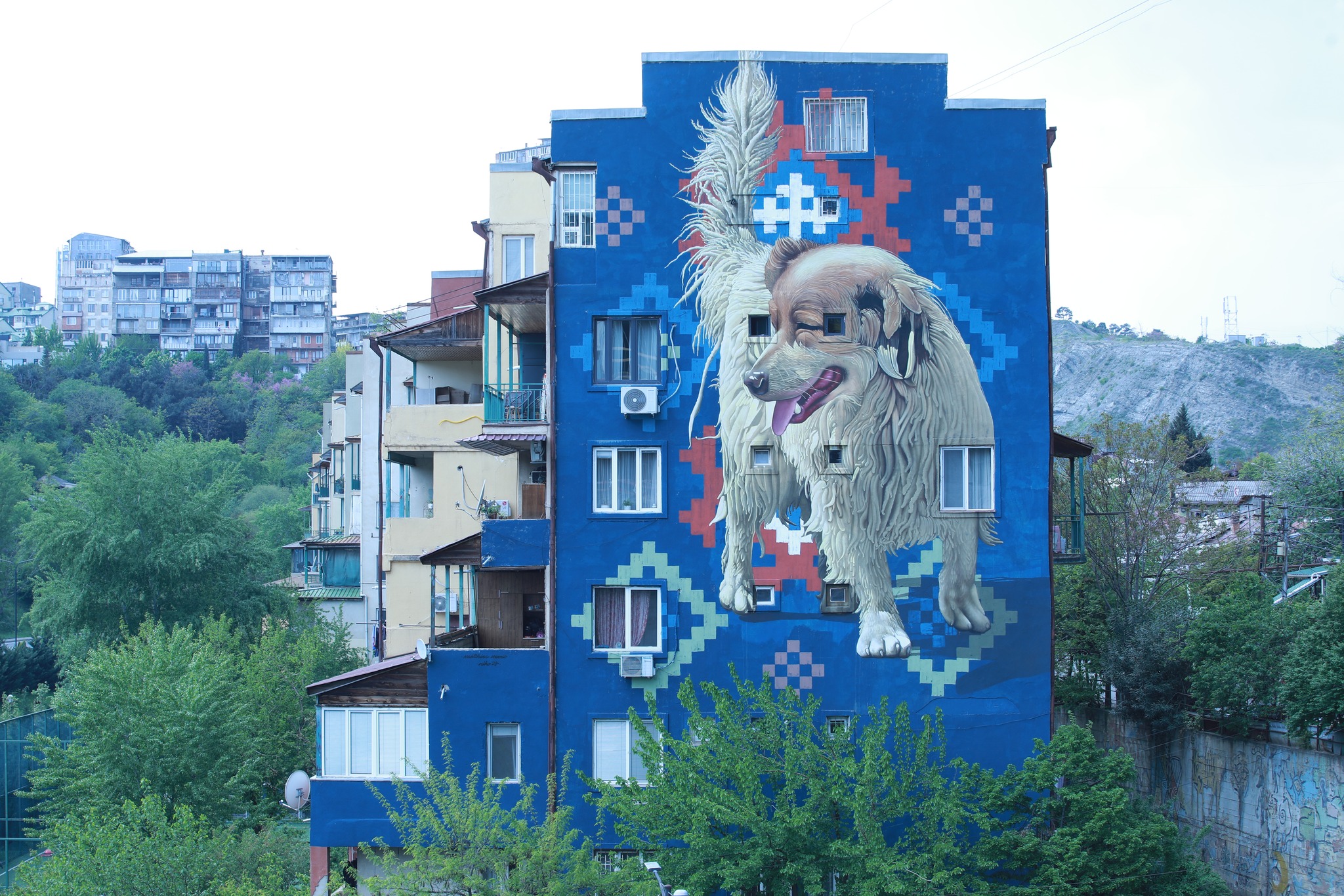 This mural depicts a typical Georgian street dog set against a traditional patterned background. In Georgia, street dogs are not seen as strays but as part of the community. They are cared for by the people and live peacefully among them - belonging to everyone and no one at the same time.