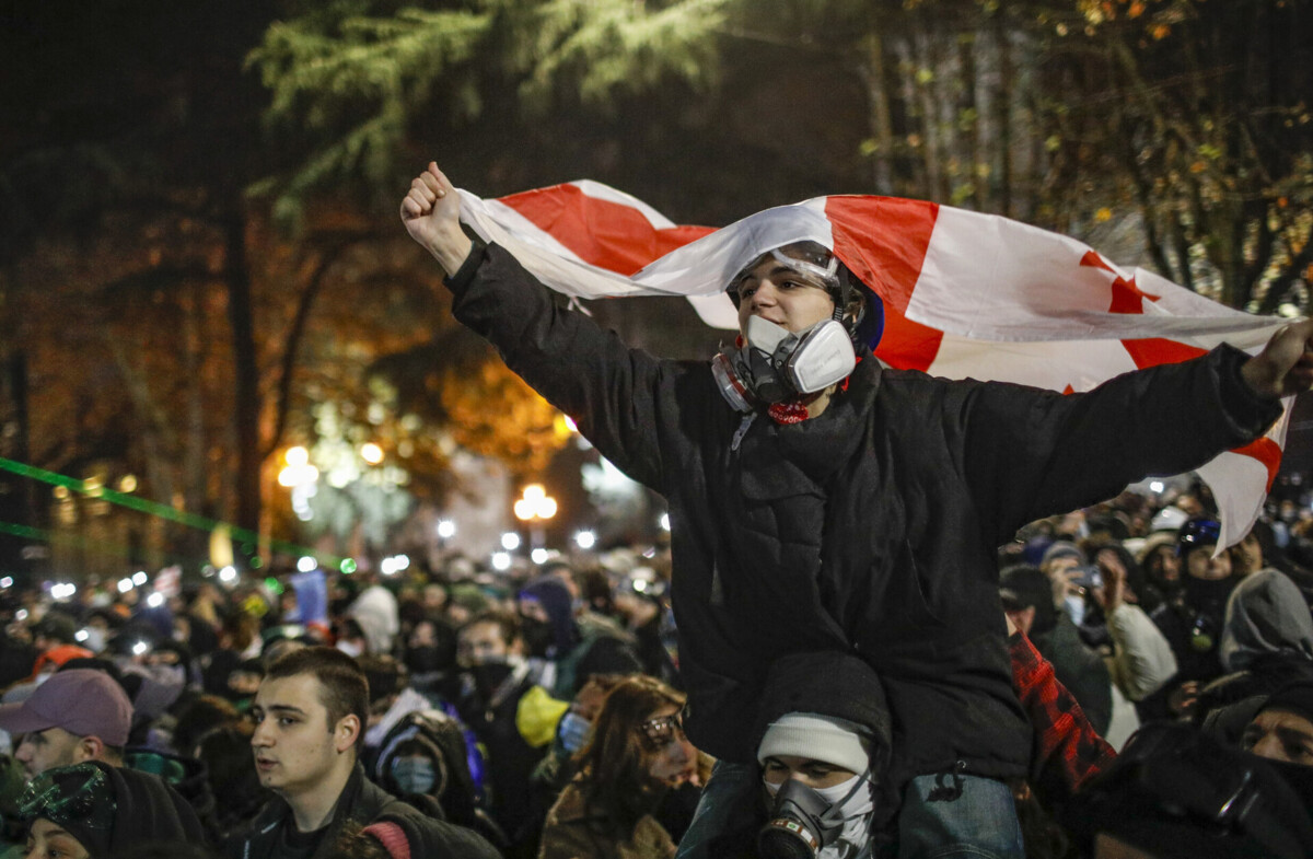 Die Statue "Mutter Georgiens", das Wahrzeichen Tbilissis mit Gasmaske und georgischer Flagge.