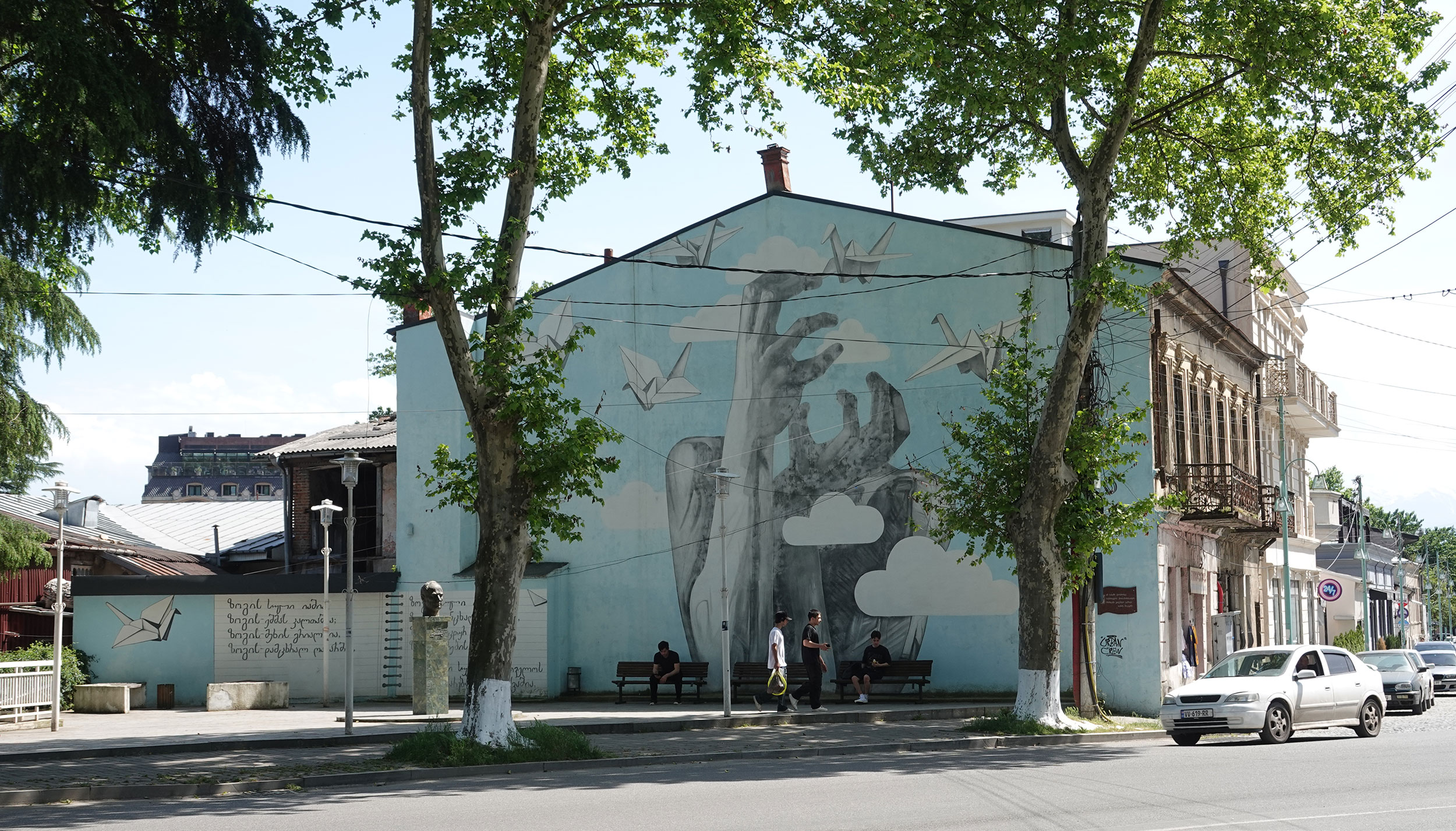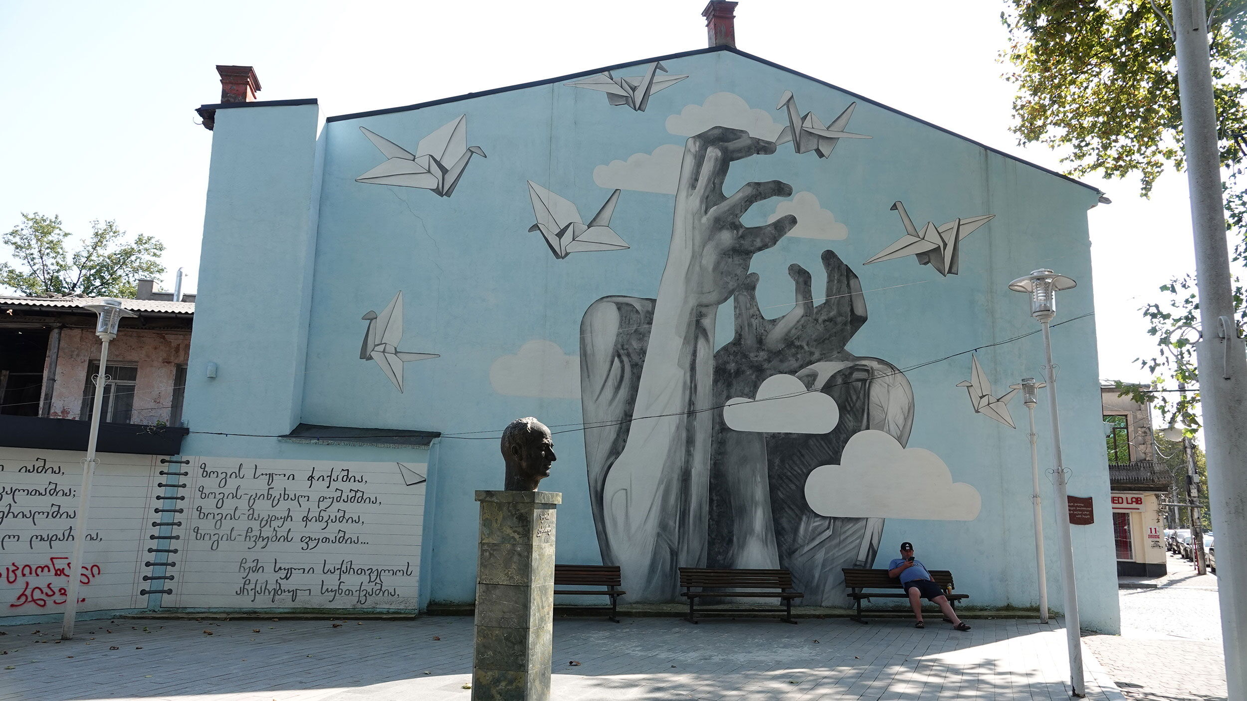 Tamaz Nikitini war ein Schriftsteller aus Kutaisi, der mit nur 26 Jahren im Russisch-Georgischen Krieg von 2008 in Südossetien gefallen ist. Das Mural befindet sich an dem Haus,in dem er lebte und zeigt einen schmerzverkrümmten Oberkörper ohne Kopf, umgeben von Origami Vögeln sowie eines seiner Gedichte, das mit den Worten endet: "Meine Seele aber liegt in Georgiens beschleunigtem Atem."