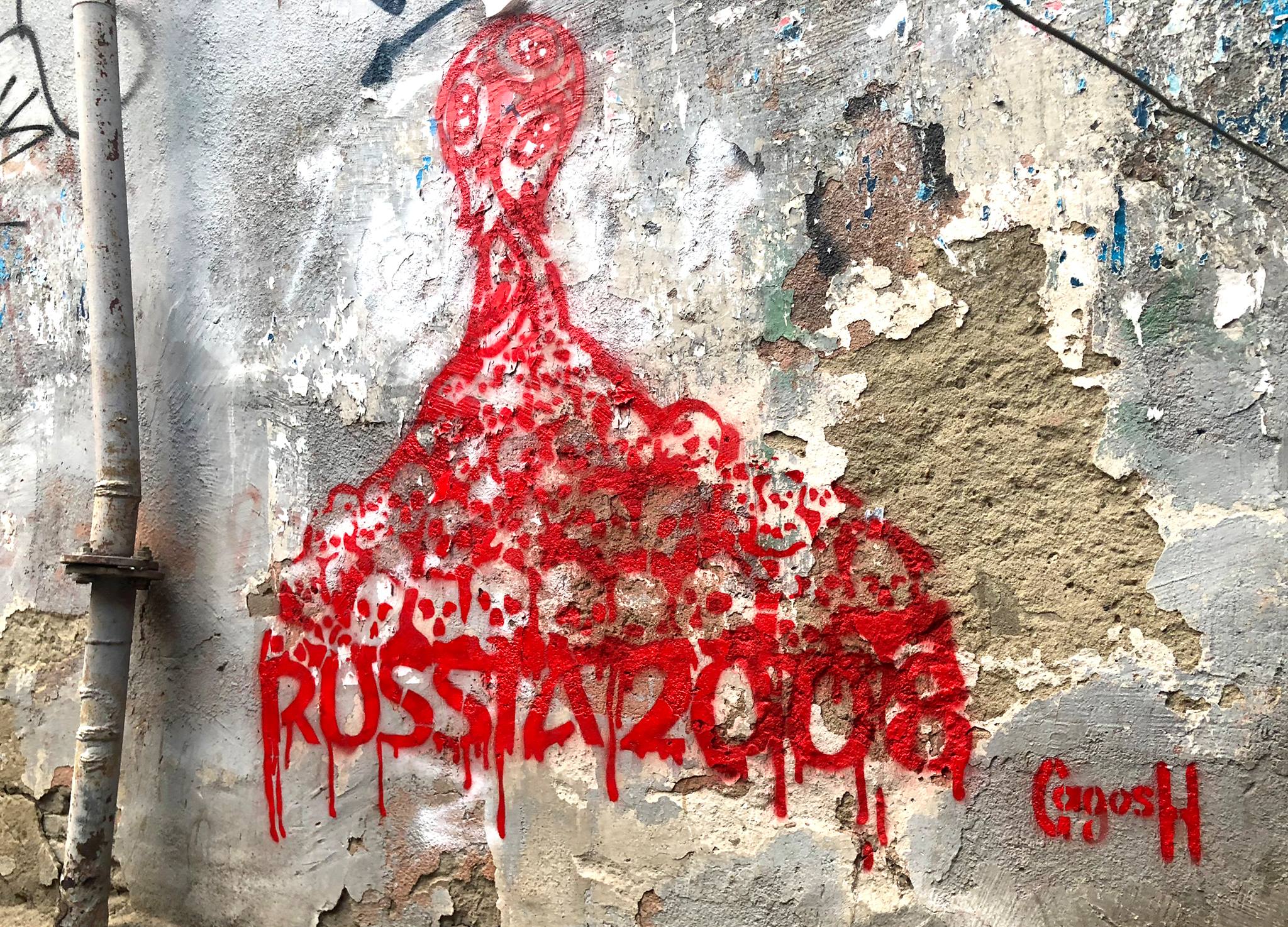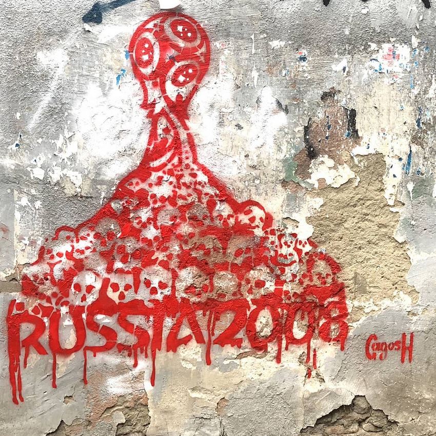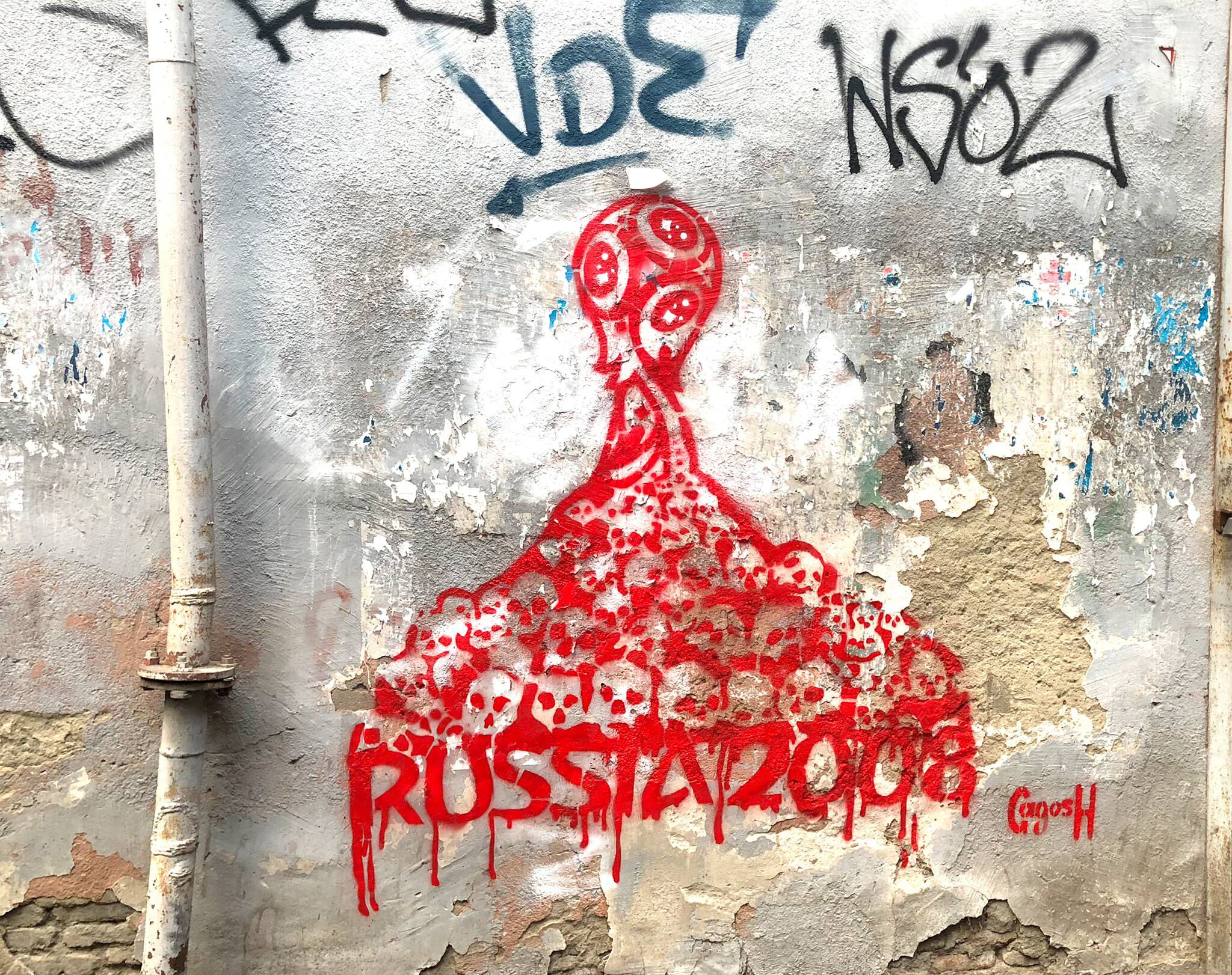 Entstanden am 8. August 2018 anlässlich des 10-jährigen Jahrestages des 5-Tage-Kriegs 2008 (Beginn 08.08.2008) zwischen Russland und Georgien. Während zeitgleich die Fußballweltmeisterschaft in Russland ausgerechnet in Sotchi (ehemals Georgien) ausgetragen wurde.