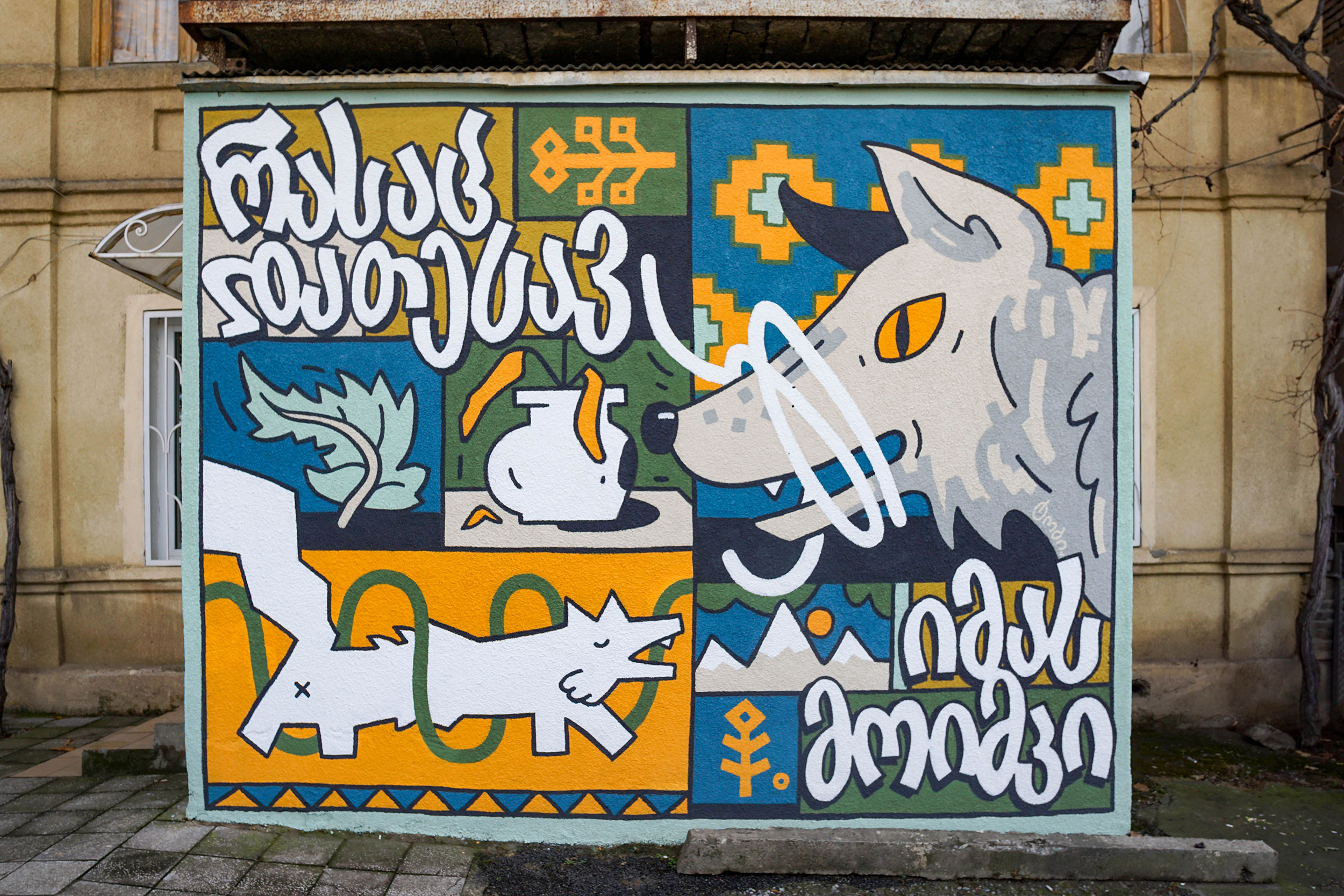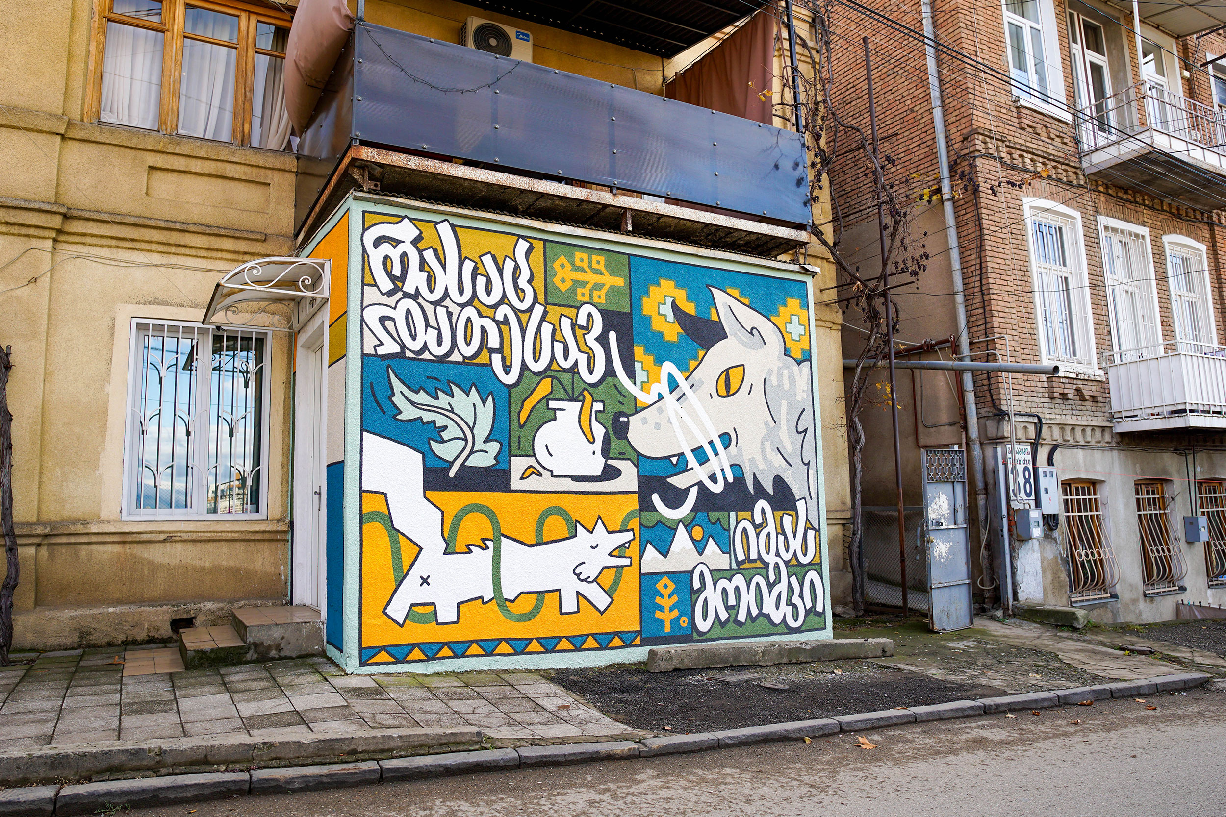The concept of the mural refers to the mythological figure of Mambera - the pagan god of Sakartvelo, who, among other things, controlled the wolves by tying their mouths with a red thread so that they would not attack those who live an honest life, and on the contrary, allowing the wolves to punish those who live dishonestly. An inscription in Georgian hangs around the wolf’s head, reminding a person of responsibility for his actions and the inevitable "you reap what you sow".