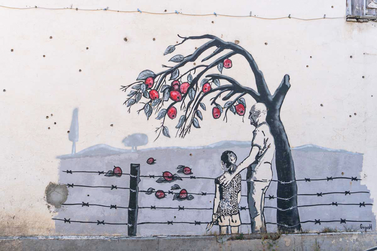 I painted this on a wall in Gori, years ago. It tells a story that is not imagined- but lived. When the wire fence came, it cut through yards, through orchards heavy with fruit, through lives that once moved freely.