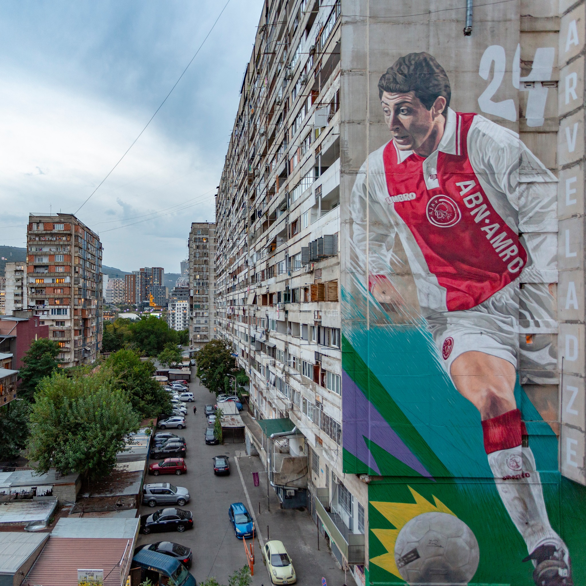 Das Large Scale Mural befindet sich an dem Haus, in dem Shota Arveladze aufgewachsen ist. Es zeigt ihn im Ajax-Trikot und würdigt damit seinen Weg vom georgischen Nachwuchstalent zum internationalen Star.