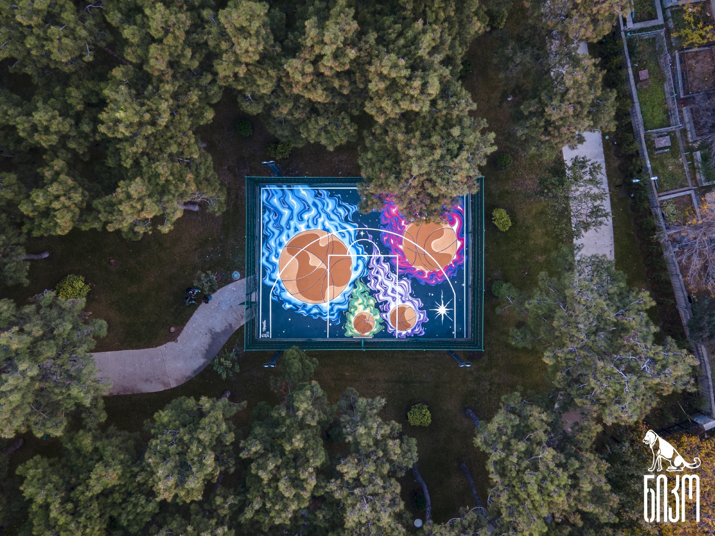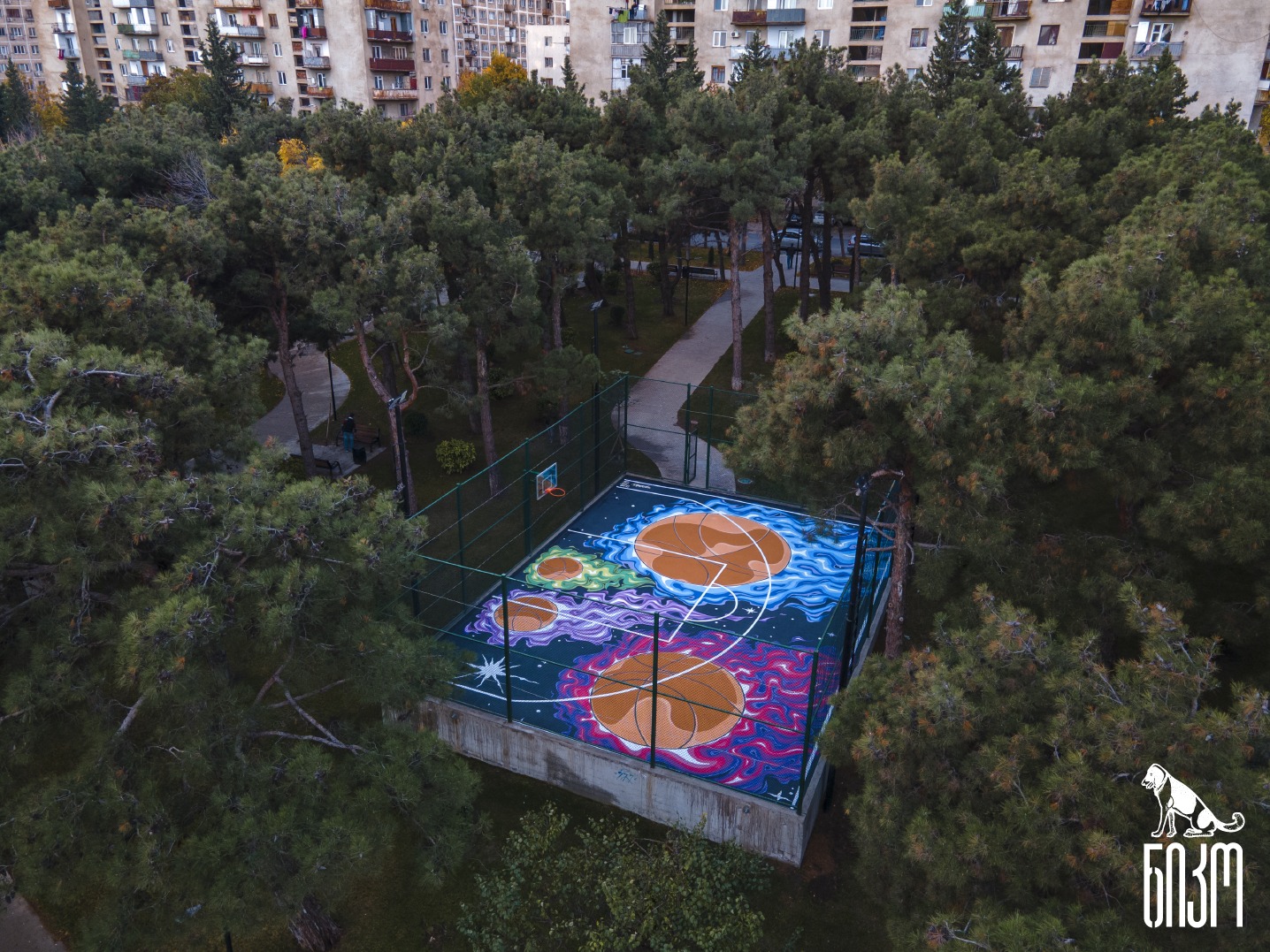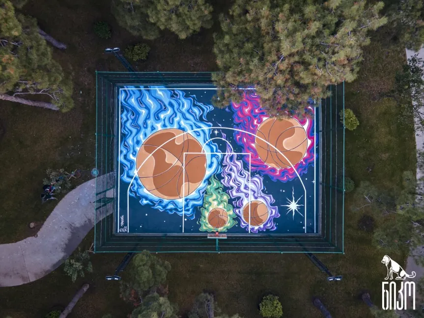 You look up in the sky and see Basketball balls falling like colorful comets, and that’s where the adventure starts. I wanted to awaken these feelings when I started painting the Basketball court in Varketili, because during the game it is very important to involve the environment.