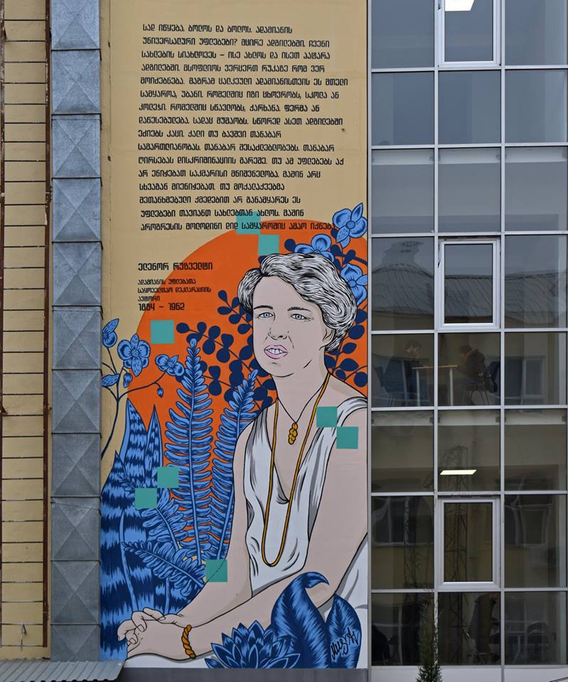 Das 13 Meter hohe Mural befindet sich im Innenhof der Ilia State University in Tbilissi und zeigt Eleanor Roosevelt - Menschenrechtsaktivistin, Journalistin, Lehrerin und Mitautorin der Allgemeinen Erklärung der Menschenrechte - als Symbol für Mut, Gleichberechtigung und gesellschaftliches Engagement.