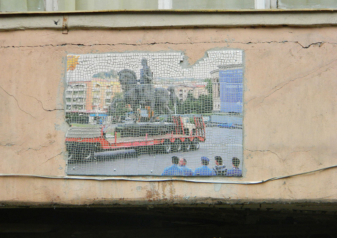 Das Mosaik ist Teil des Projekts "Media Graffiti", bei dem der Künstler Bilder georgischer Fernsehnachrichten in Mosaike verwandelt und in den Straßen Tbilissis installiert hat.