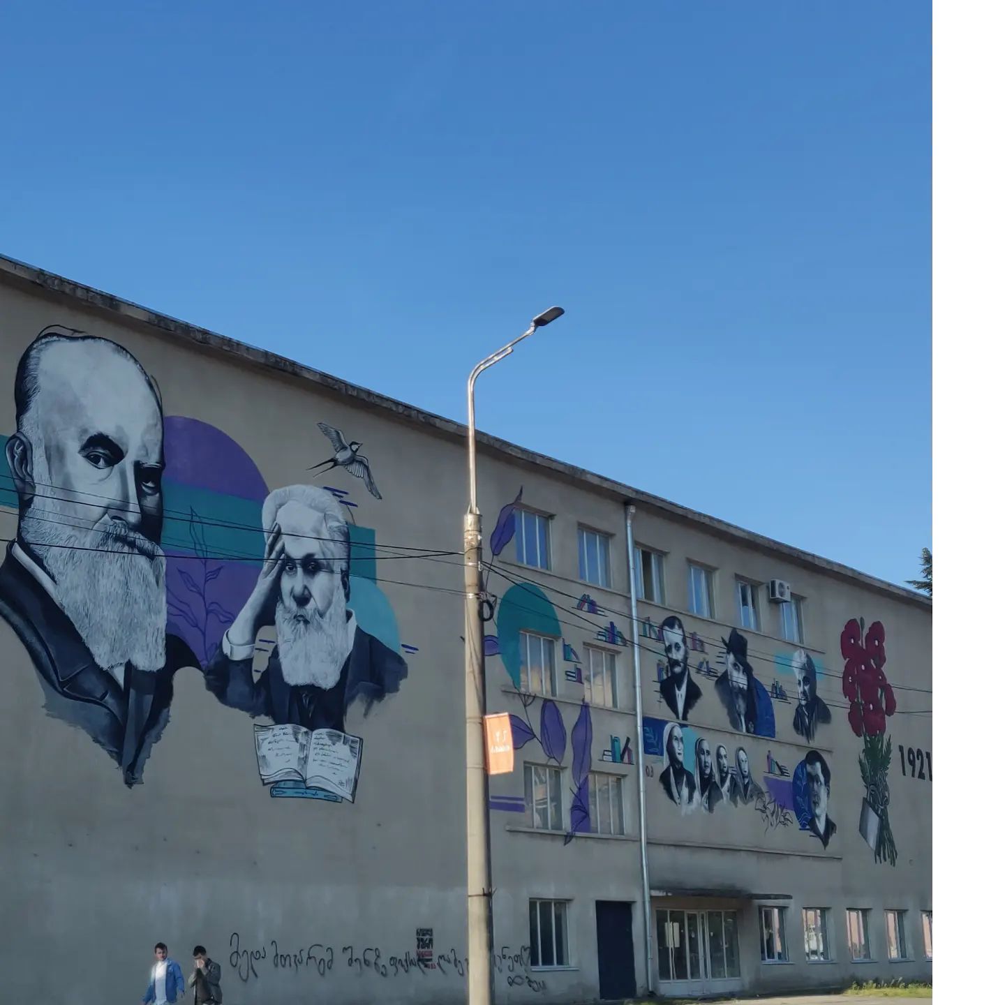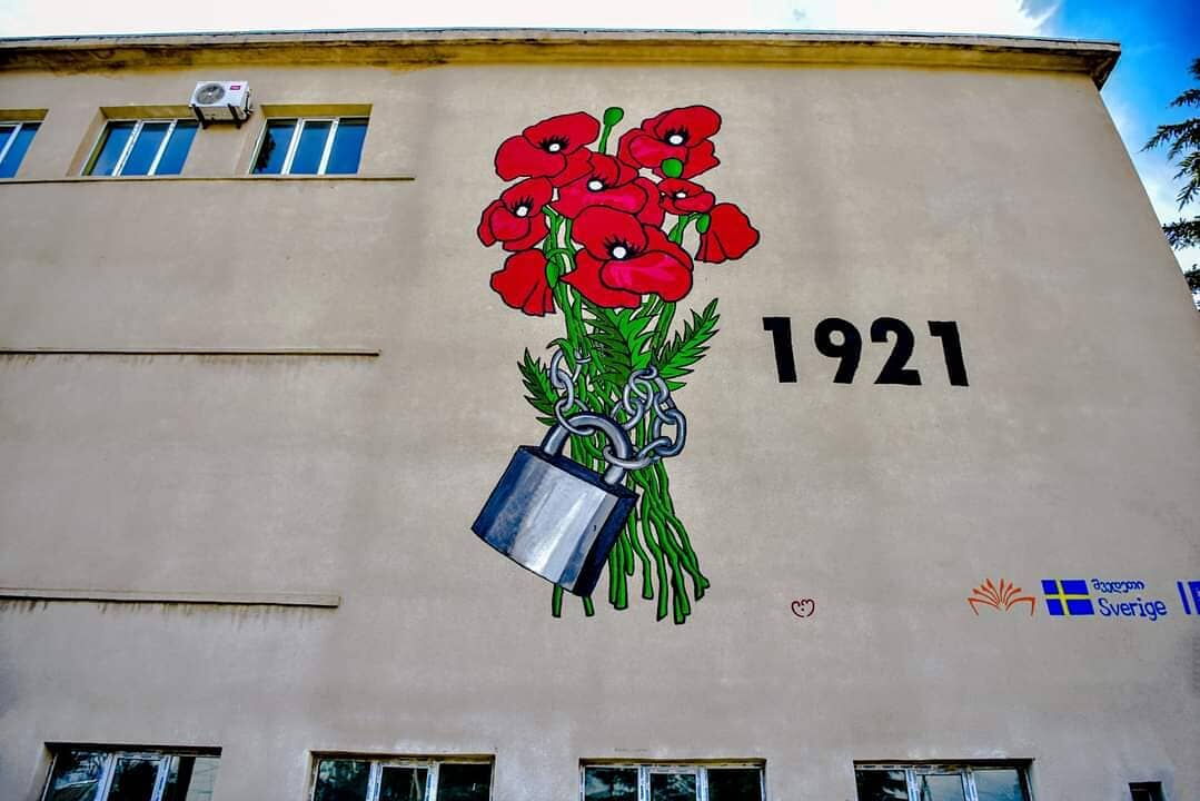 Mural zum 100. Jahrestag der Sowjetischen Besetzung an der Fassade des Niko-Nikoladze-Gebäudes der Nationalbibliothek Georgiens, die das größte Buchlager im Kaukasus mit rund 3 Millionen Büchern beherbergt.