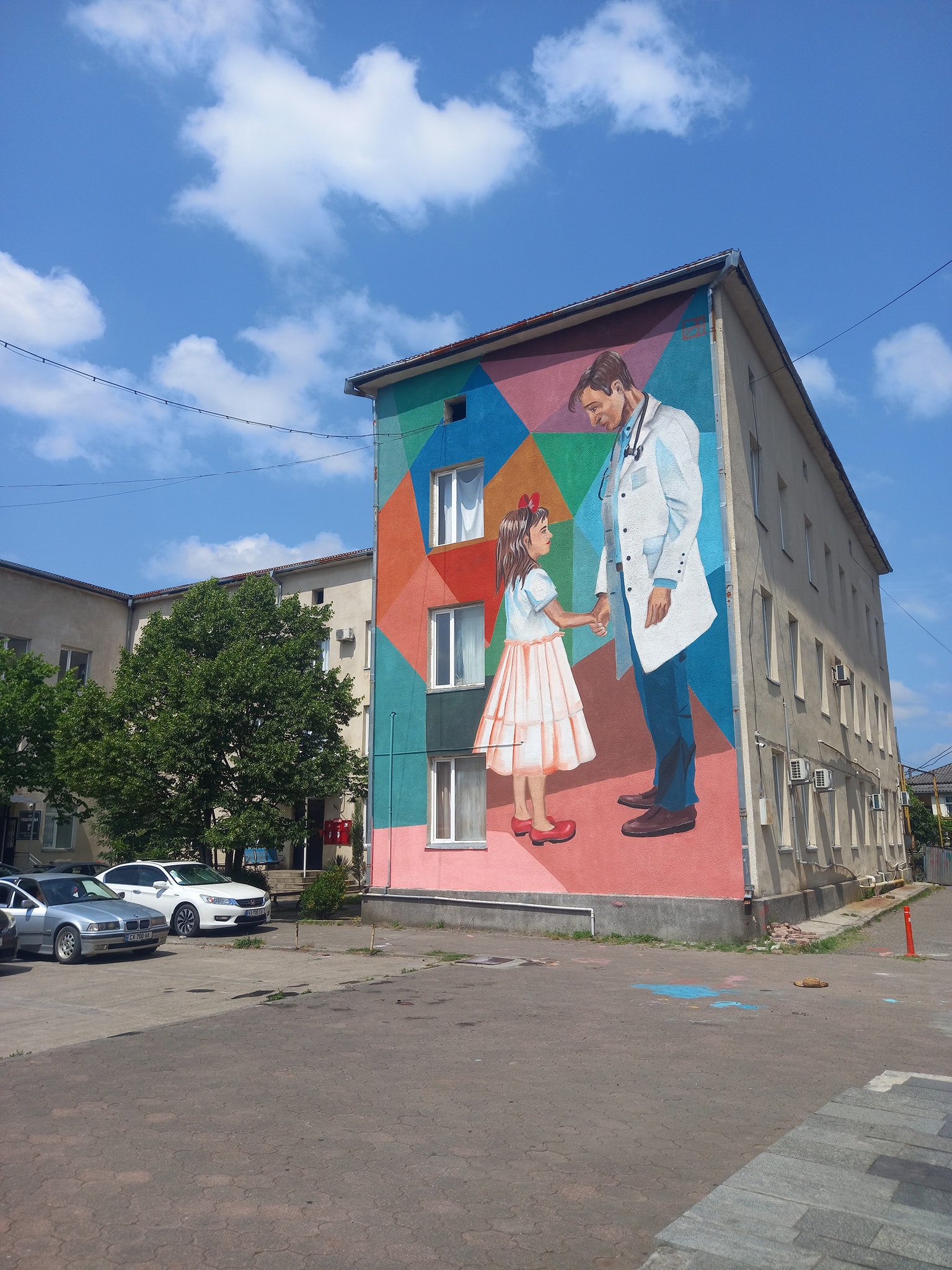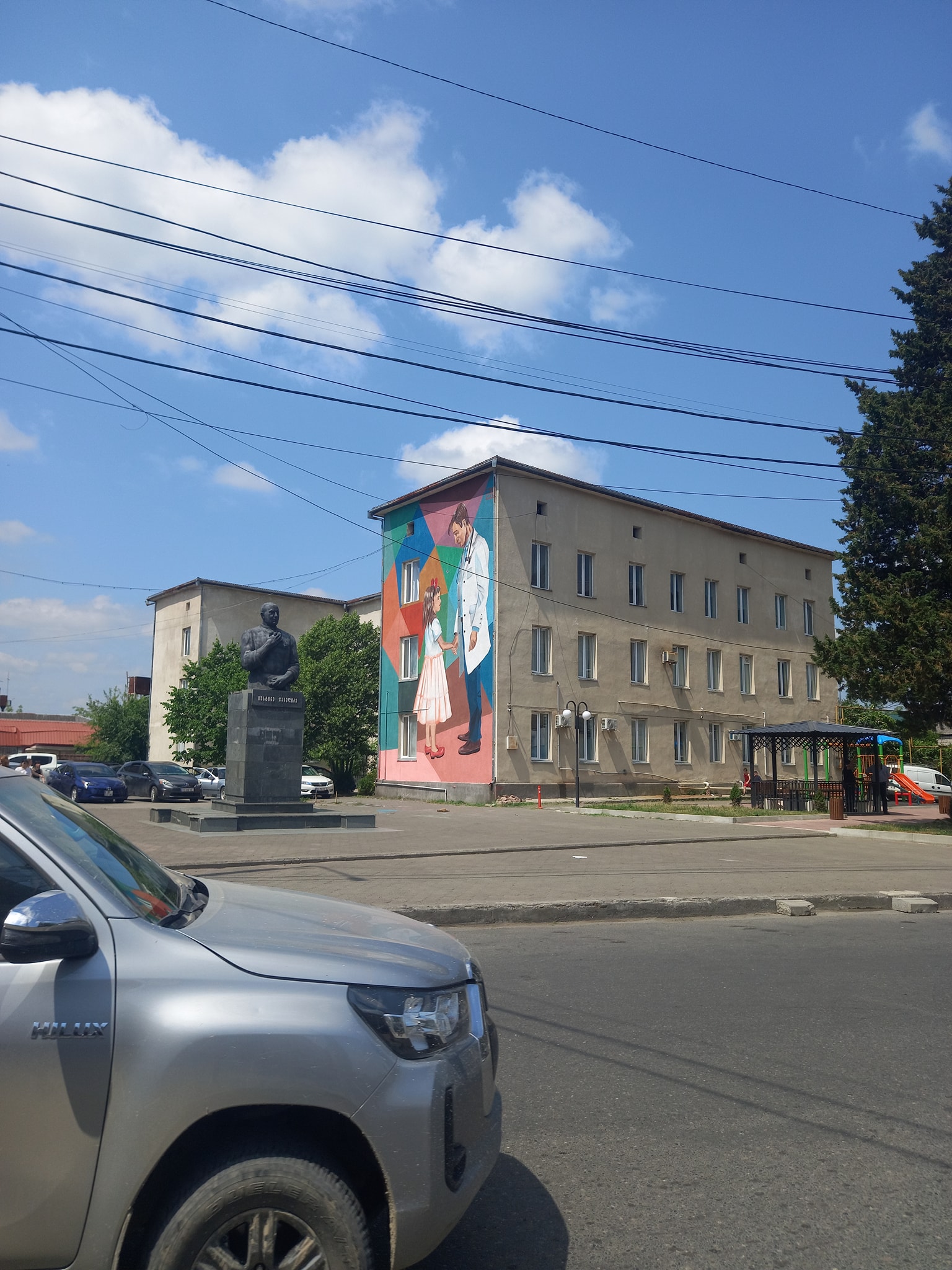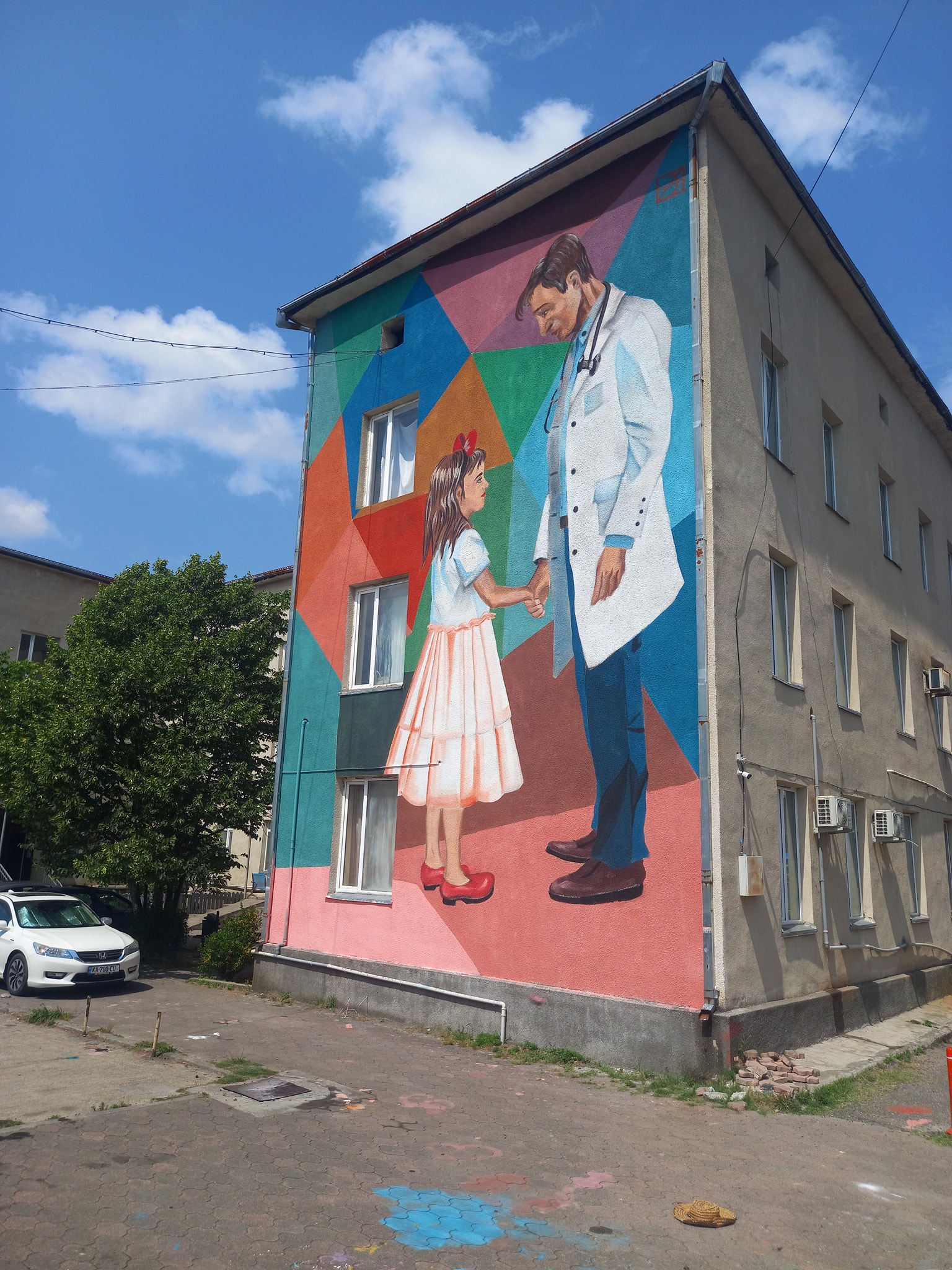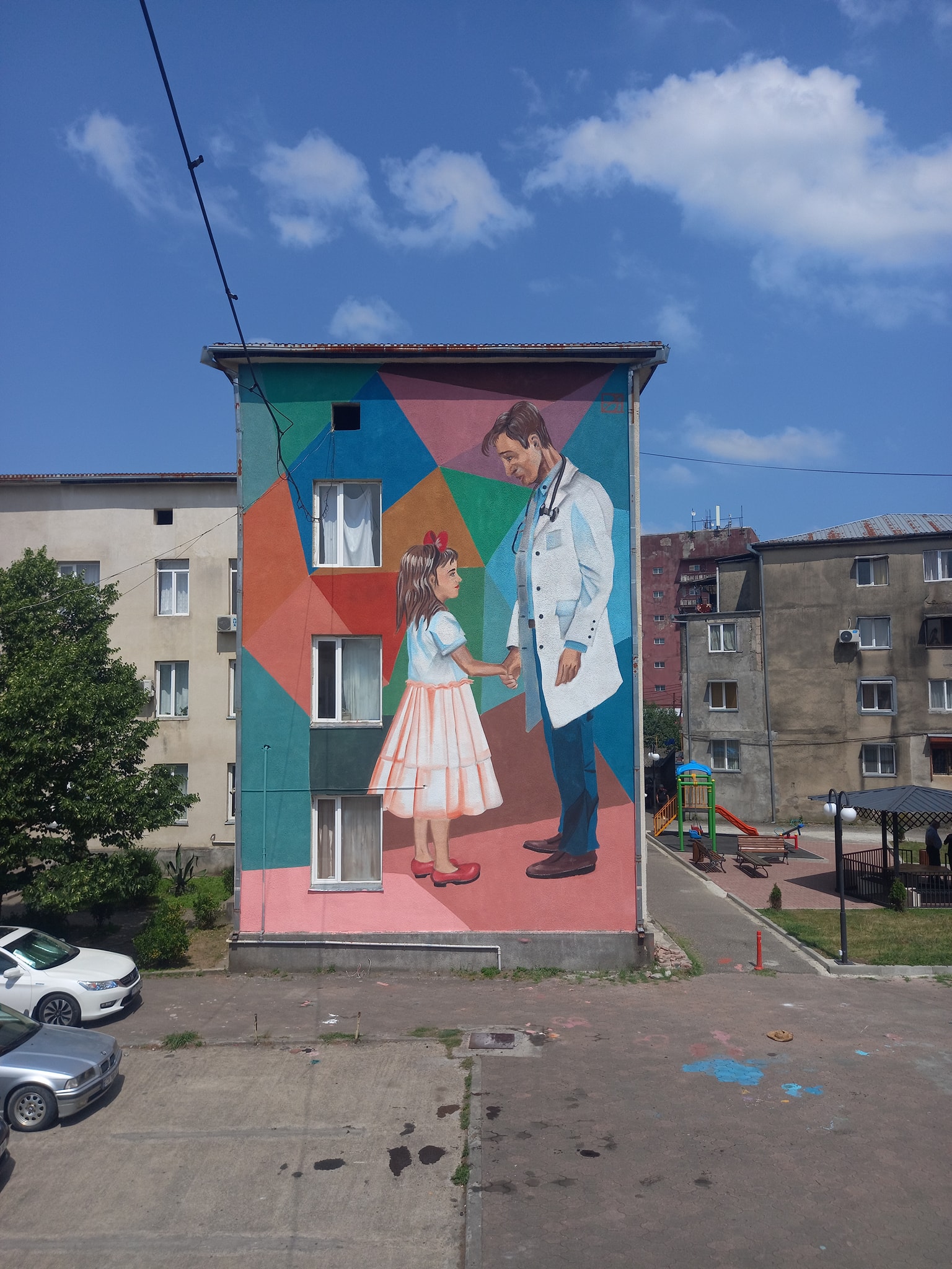 Mural am Samtredia Hospital. Justine Janelidze war ein georgischer Arzt, Wissenschaftler, Aktivist und einer der Pioniere der Herzchirurgie weltweit.