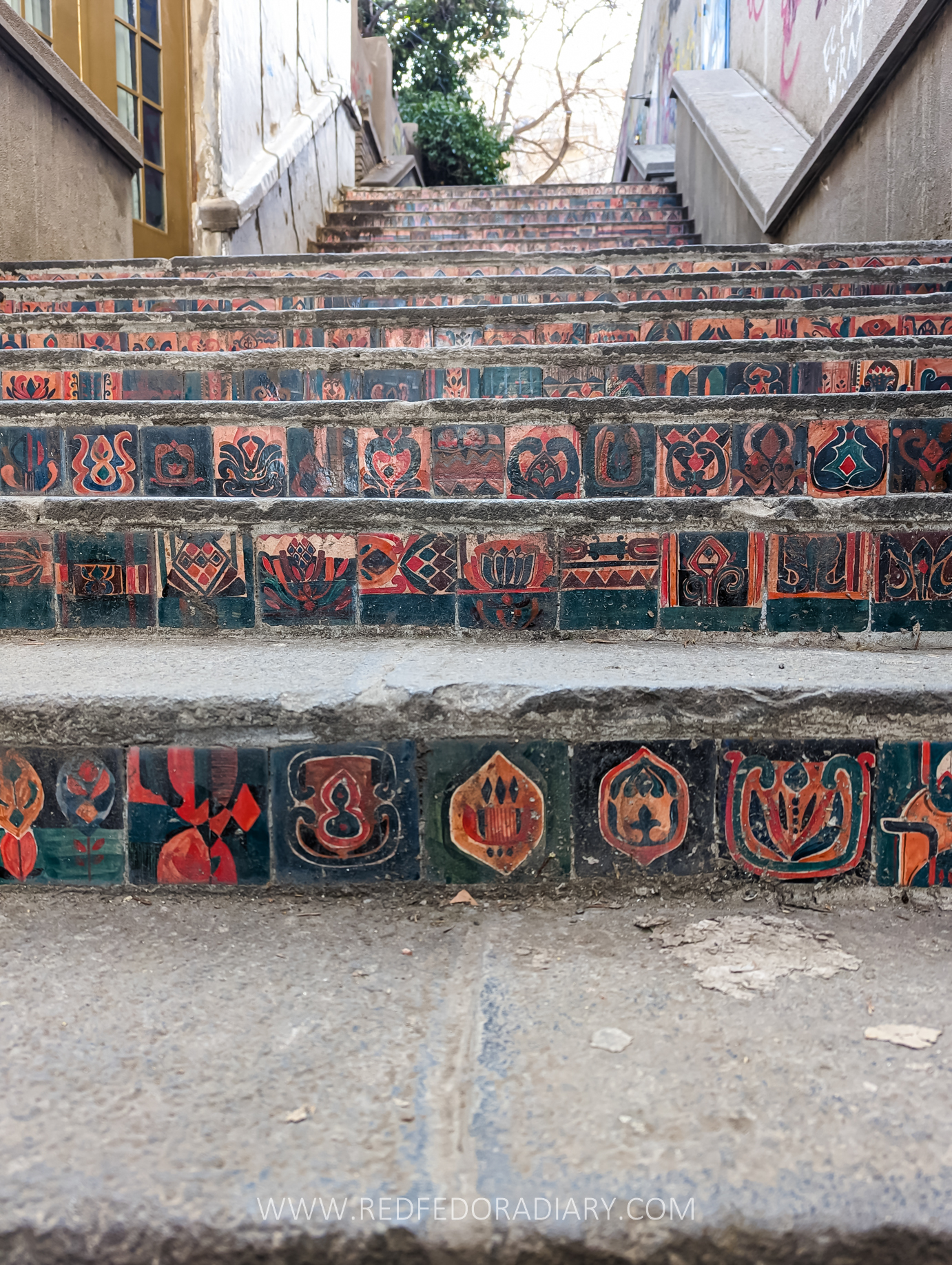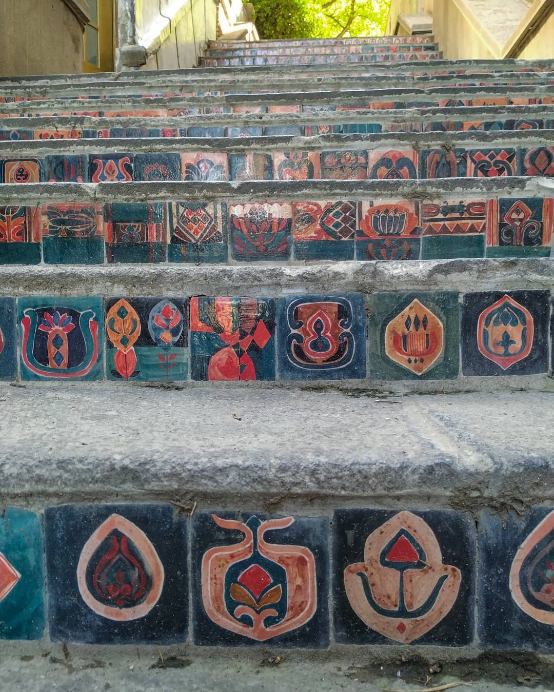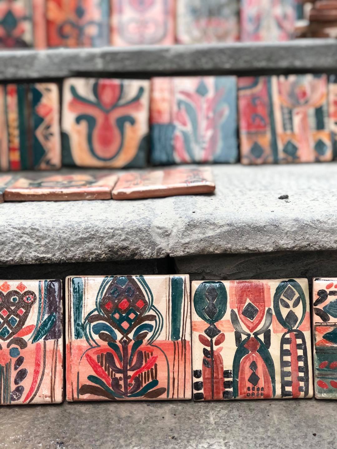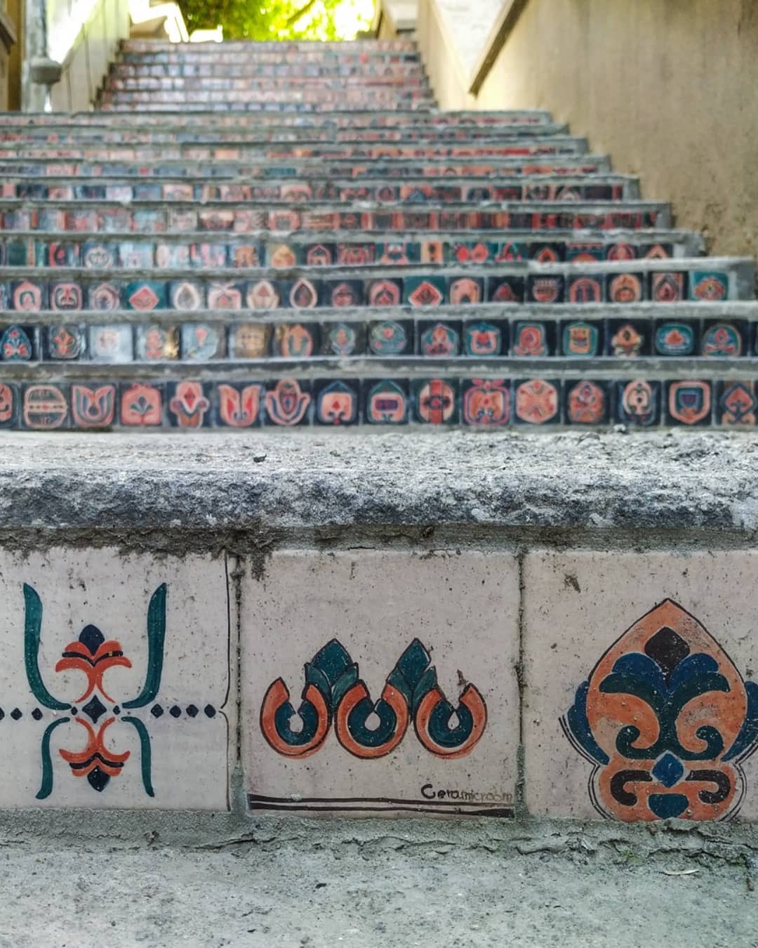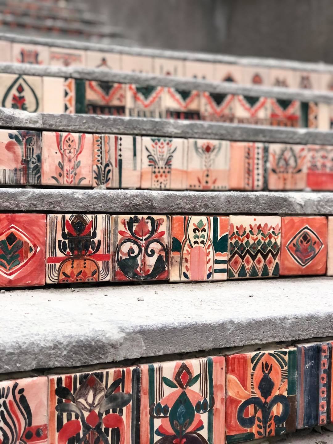 Die Treppe zur Kunstakademie in Tbilissi ist eines der bedeutendsten Projekte des Studios Ceramic Room. Auf 70 Stufen wurden rund 2.000 handgefertigte und individuell bemalte Fliesen (10x10 cm) aus georgischem Ton verlegt. Das Kunstwerk greift historische architektonische Ornamente auf und überführt sie in eine zeitgenössische Form. So entstand ein lebendiger Ort, der Elemente der georgischen Geschichte bewahrt und dauerhaft im öffentlichen Raum installiert.