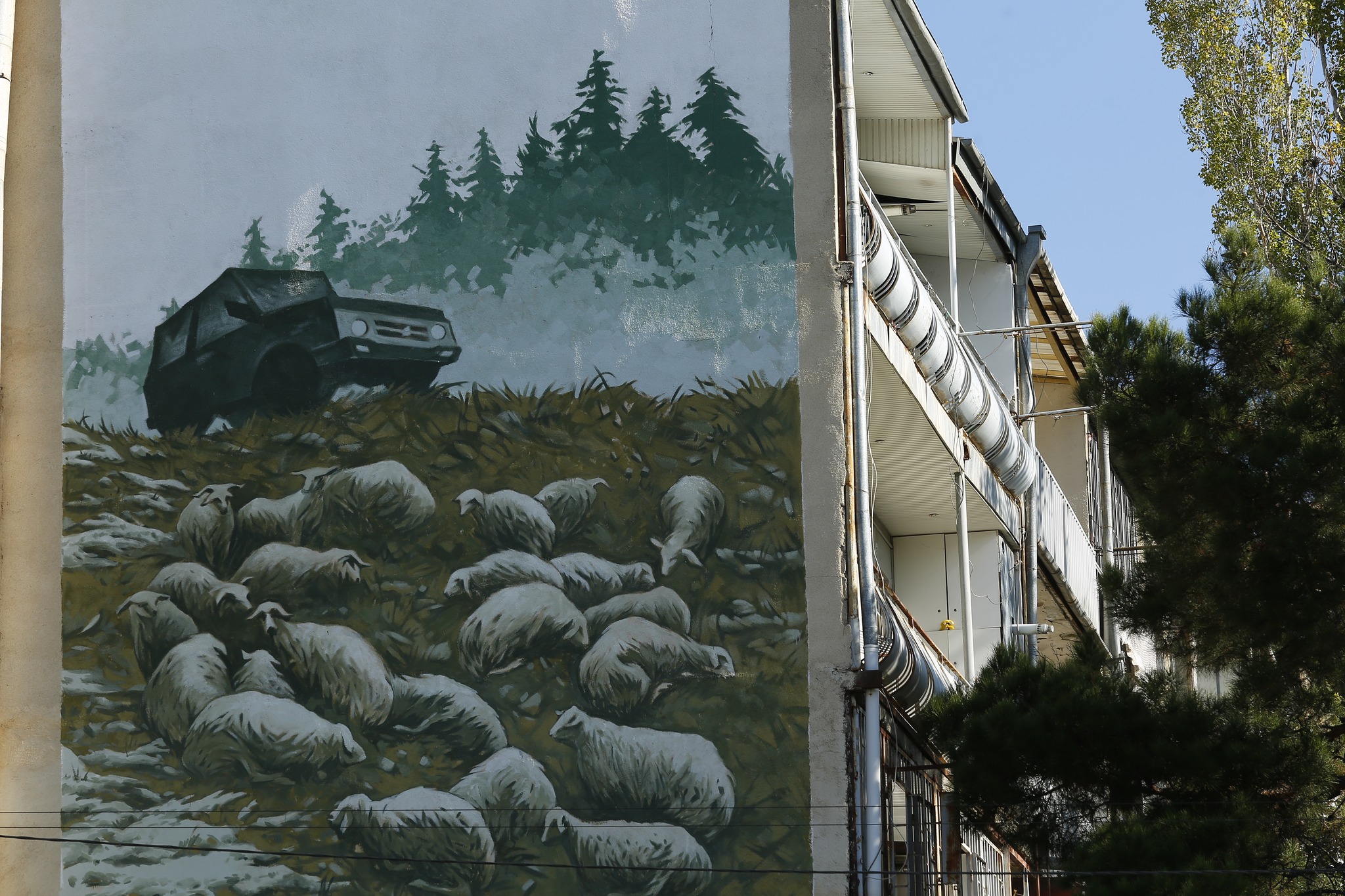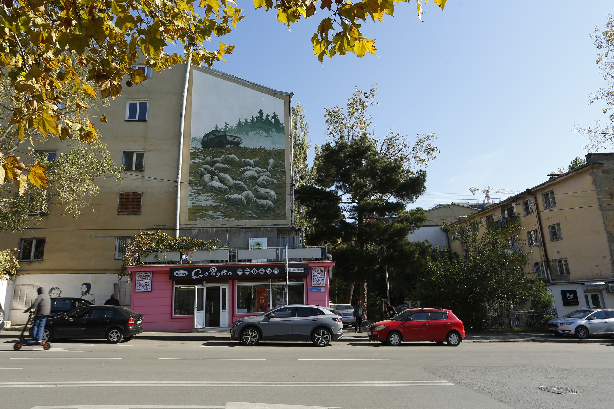 We, on the other hand, have to wait in traffic just for ten or twenty minutes and go completely crazy: we curse, look for opportunities to overtake, signal each other, and make the traffic jam even worse. The difference of those emotions inspired me to paint this motif for the wall, because that’s how Tbilisi lives, in speed, chaos, lack of empathy for each other, and indescribable noise.
